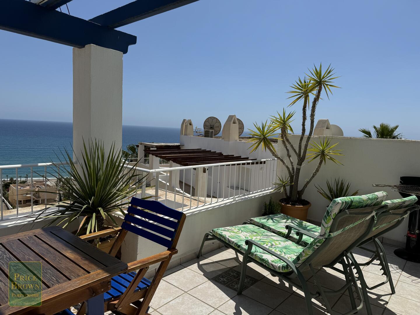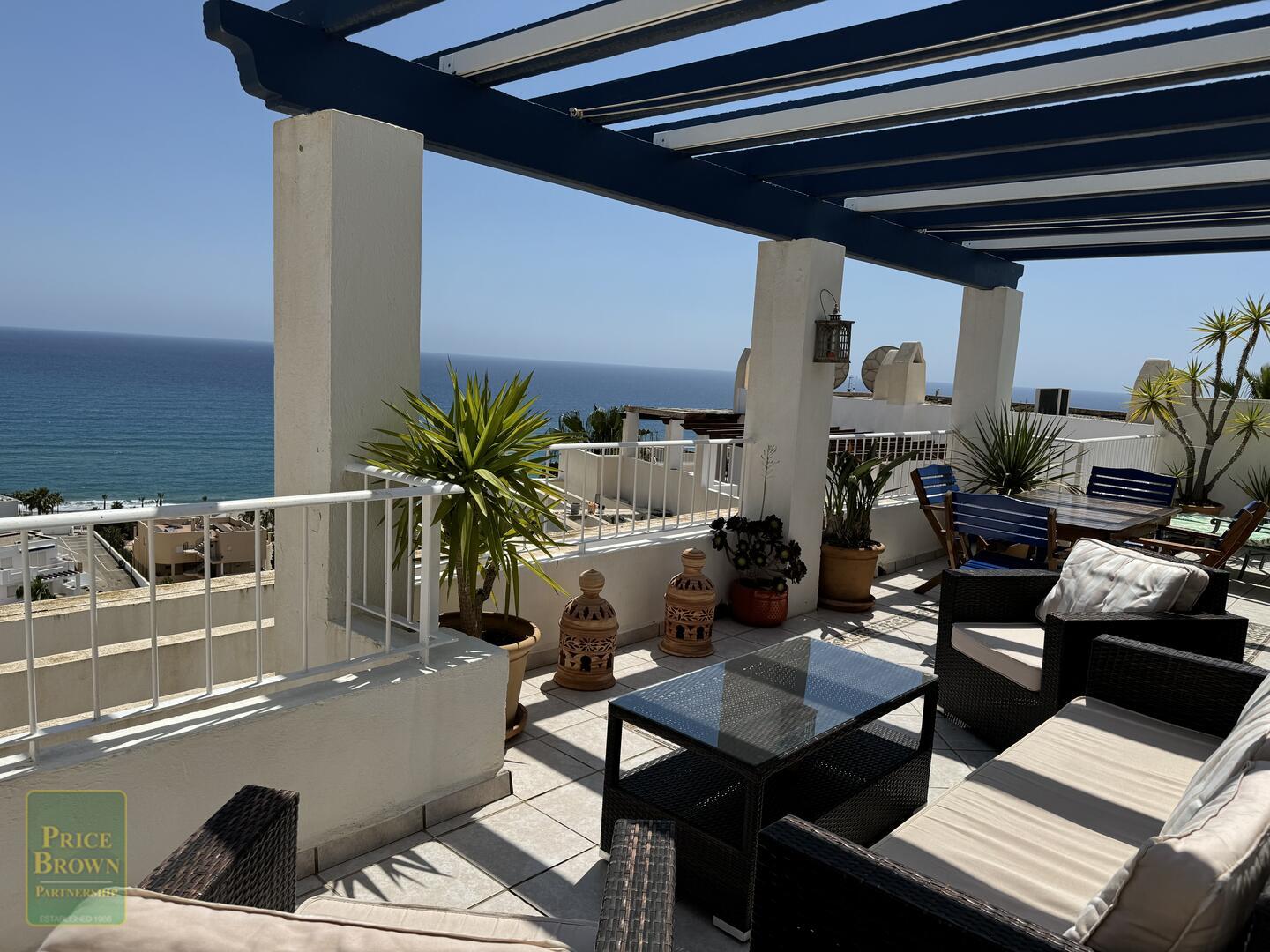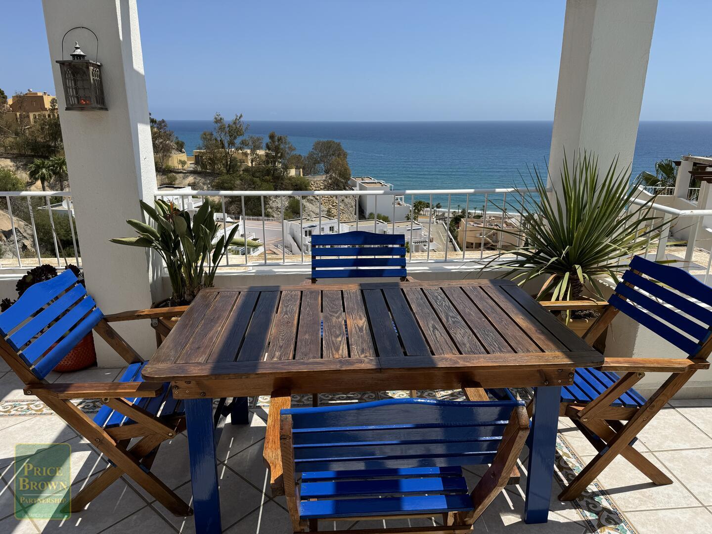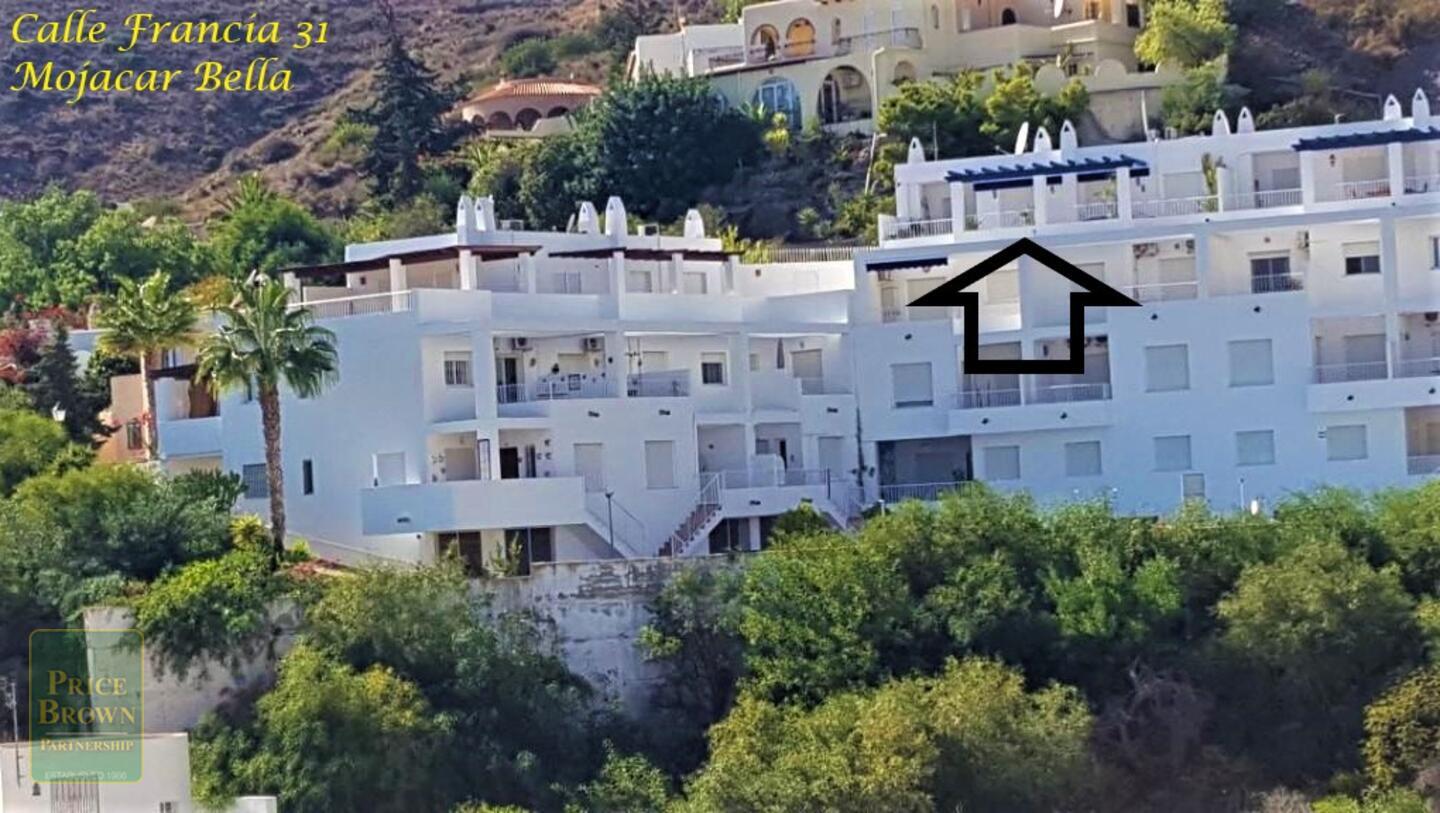 Mojácar Bella: Impresionante y magníficamente presentado apartamento con una enorme terraza de 43m2 con impresionantes vistas a la playa y al mar. Este ático orientado al este muestra perfectamente el amanecer en Mojácar y tiene un buen ambiente contemporáneo con una decoración elegante en todas partes. ¡Es luminoso, espacioso y aireado con vistas al mar desde todas las habitaciones excepto el baño! Consta de salón con puertas que dan a la terraza, aire acondicionado, una cocina de buen tamaño con puertas a la terraza y ventana grande, dormitorio principal con armarios empotrados, aire acondicionado y puertas a la terraza, segundo dormitorio doble con armarios empotrados y aire acondicionado, baño completo con ducha y lavabo doble. Mojácar Bella tiene una piscina comunitaria recientemente reformada y jardines bien cuidados. Los gastos de comunidad son sólo 49€ al mes.Incluido en el precio está el garaje cerrado.