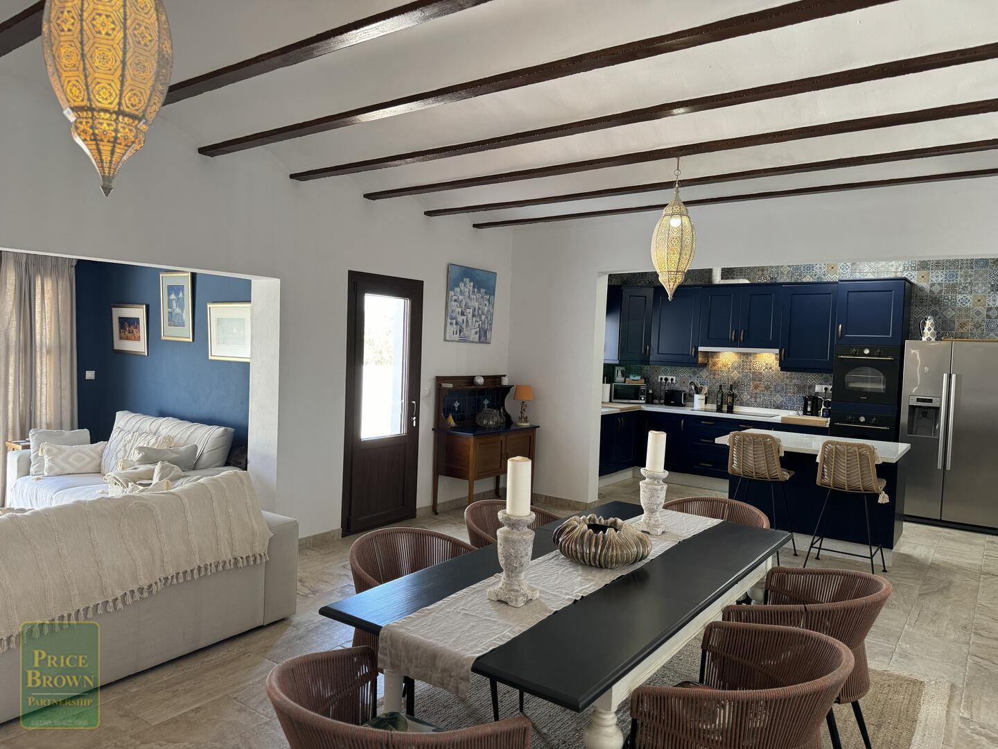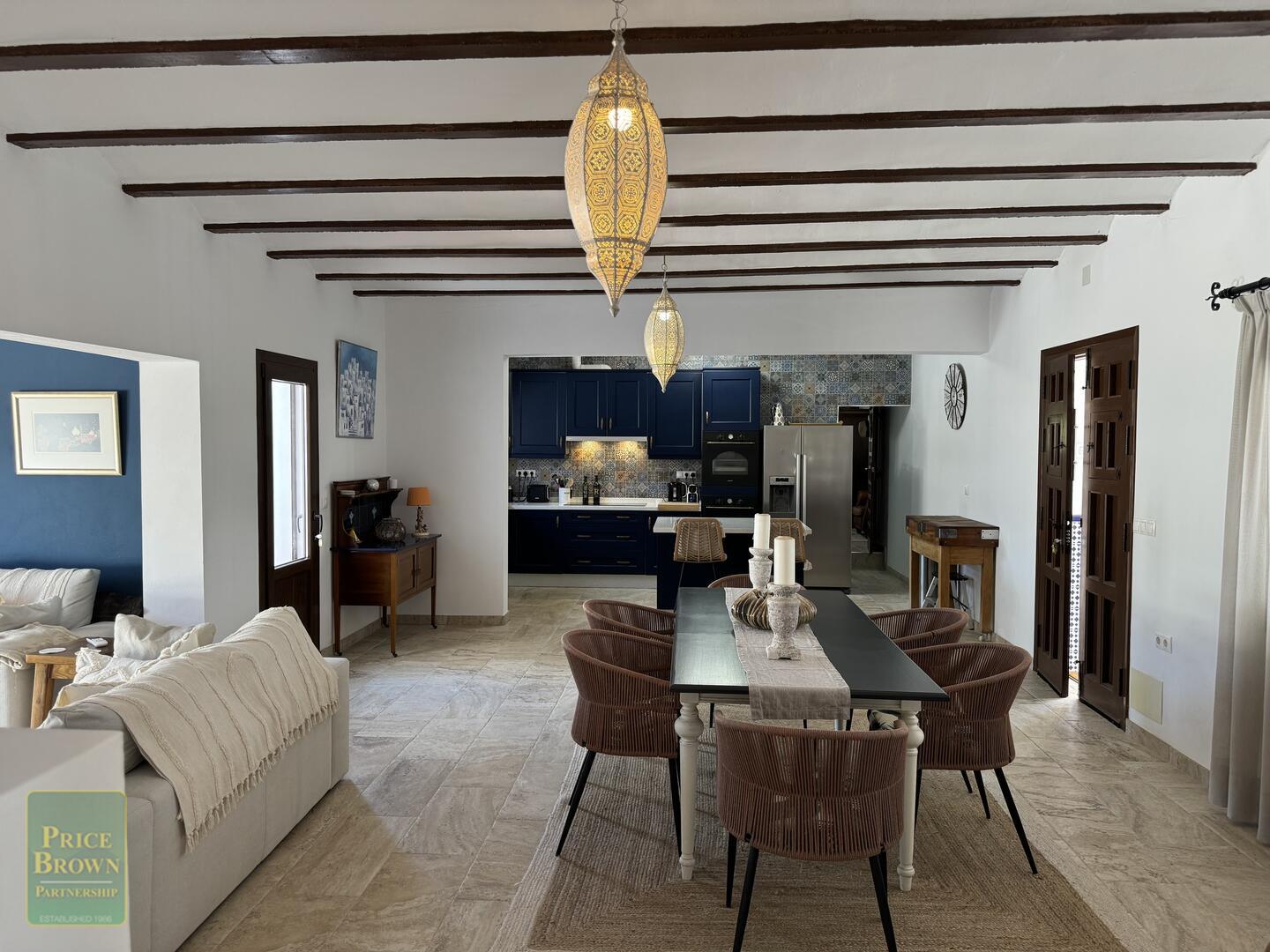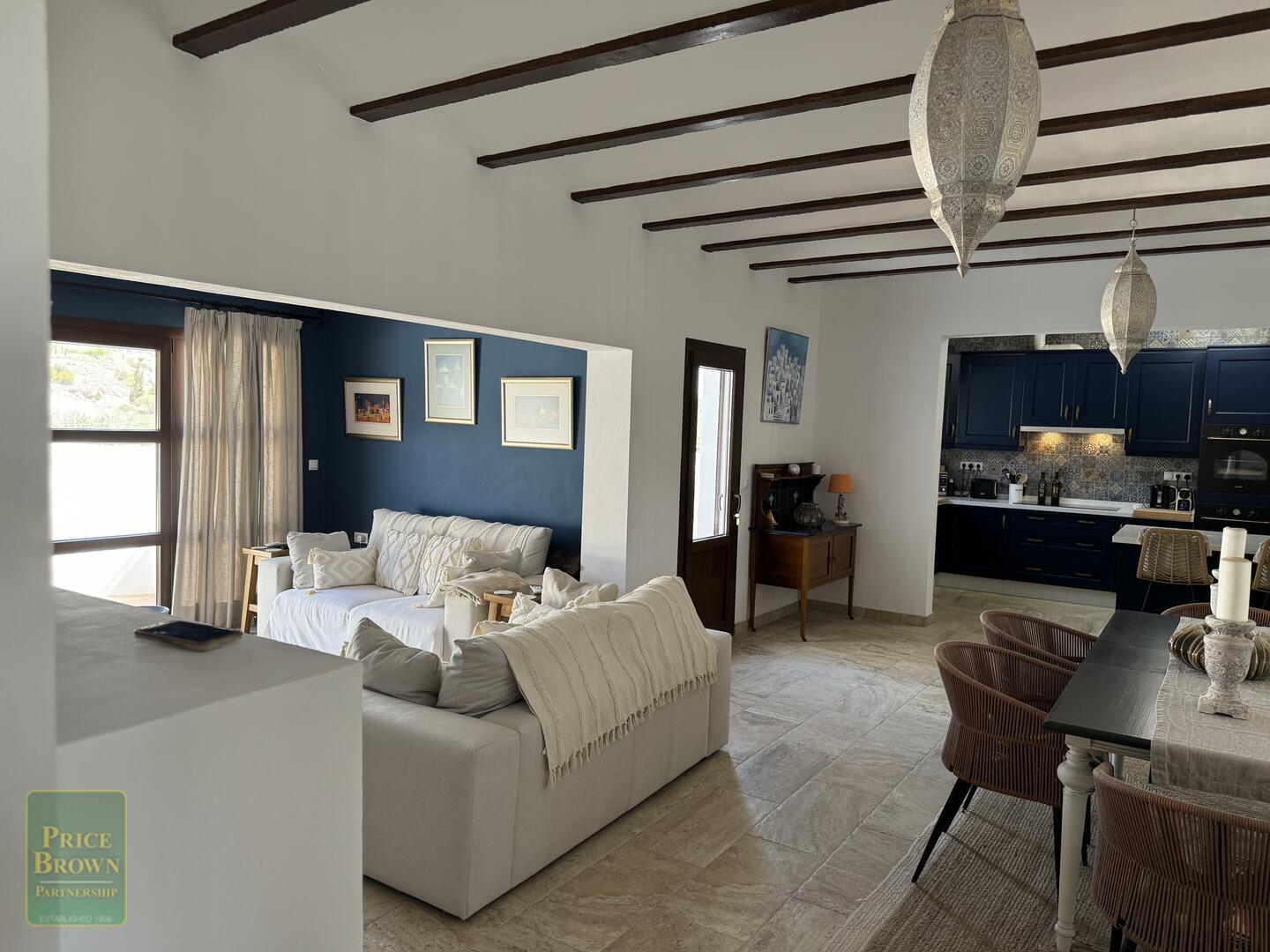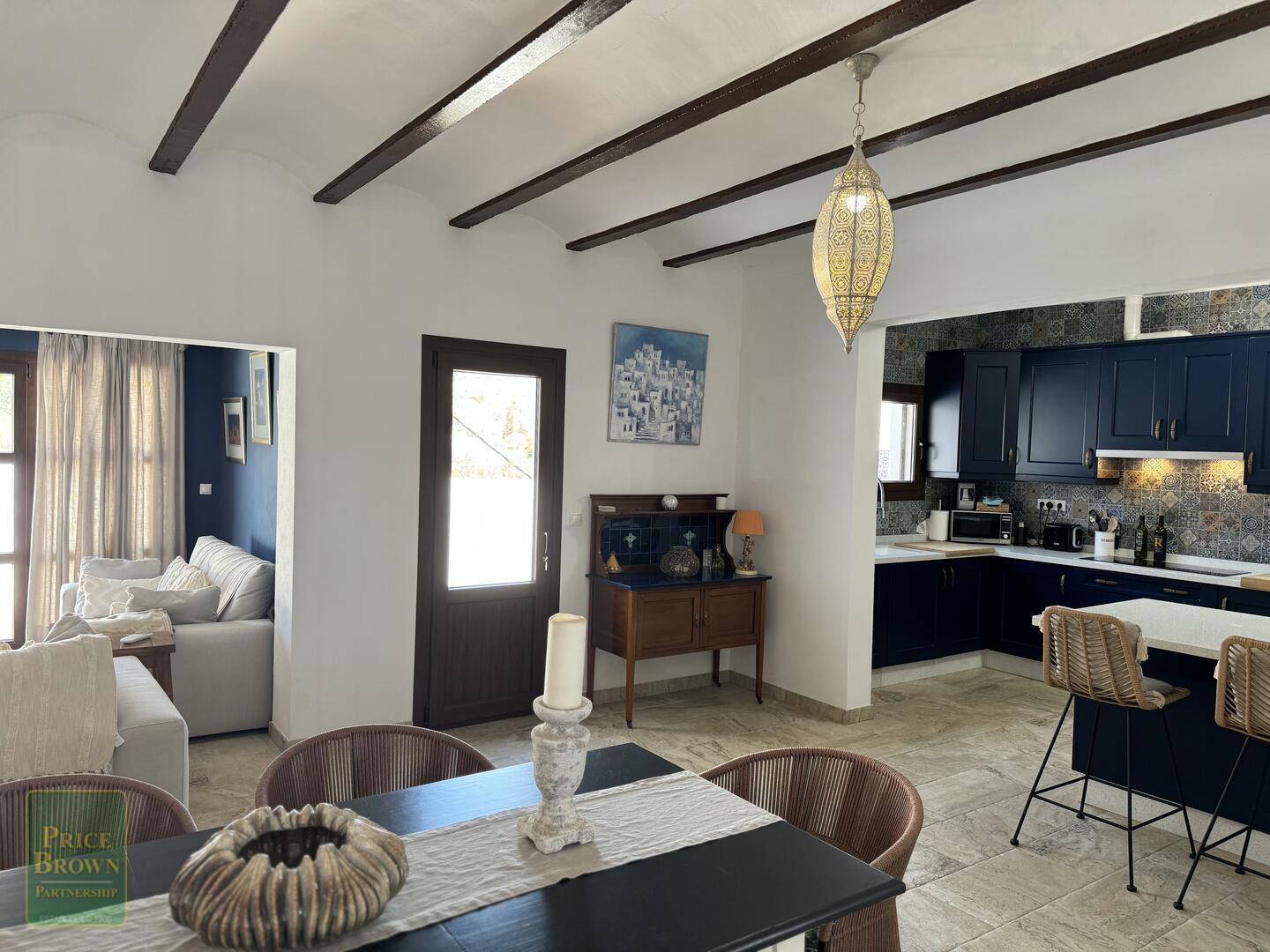 La casa principal consta de un área de entrada externa parcialmente cubierta con arcos que albergan una gran mesa de comedor perfecta para cenar al aire libre. Desde aquí se accede a la propiedad principal que consta de comedor de planta abierta, sala de estar y cocina, lavadero, dormitorio doble con baño en suite, dos dormitorios dobles; uno actualmente utilizado como oficina y un baño familiar. La sala de estar tiene una chimenea abierta y puertas dobles que dan a una terraza con excelentes vistas a las montañas. La cocina es moderna pero con carácter, con una hermosa isla central. Ambos baños presentan líneas limpias y despejadas.