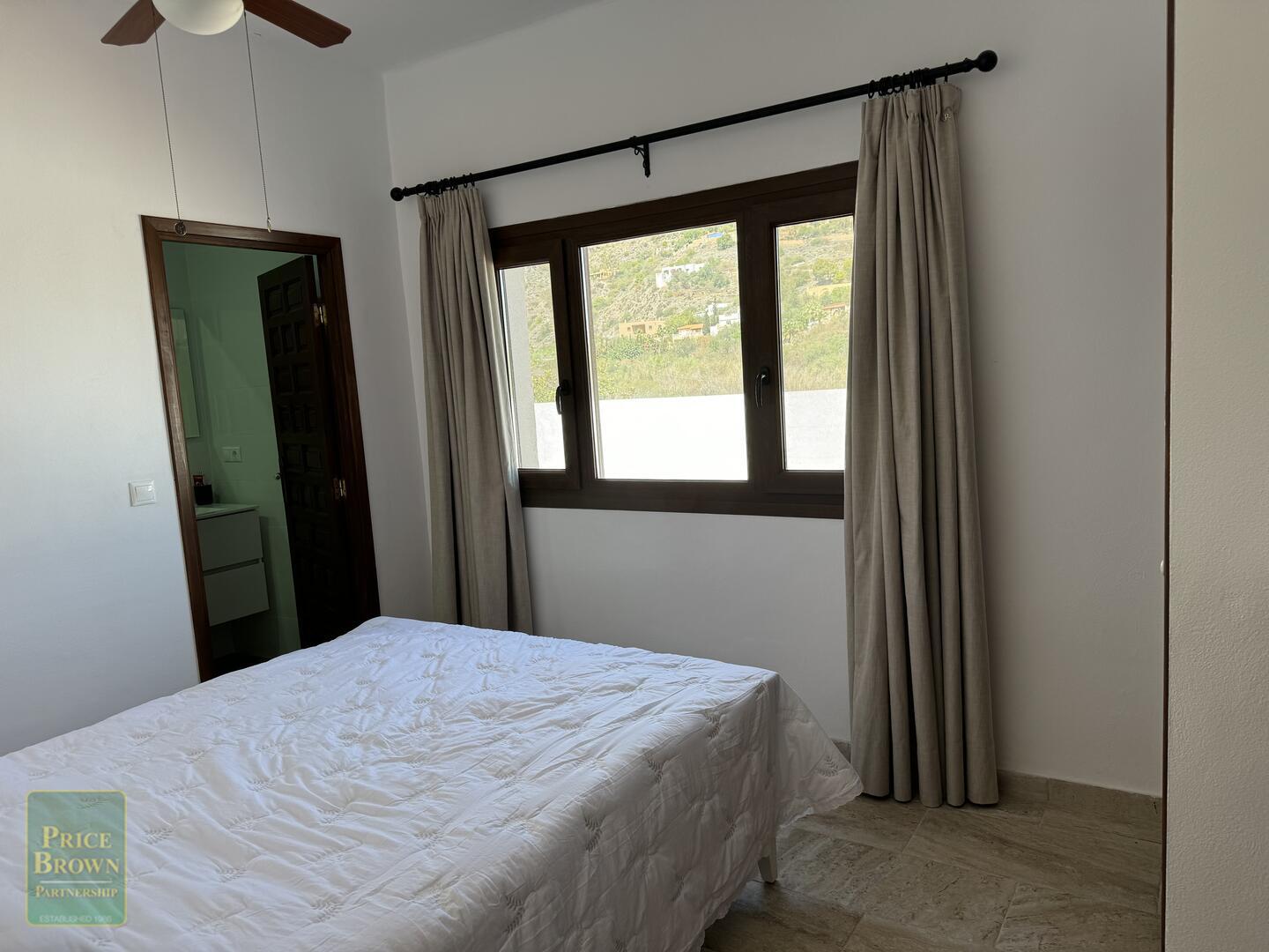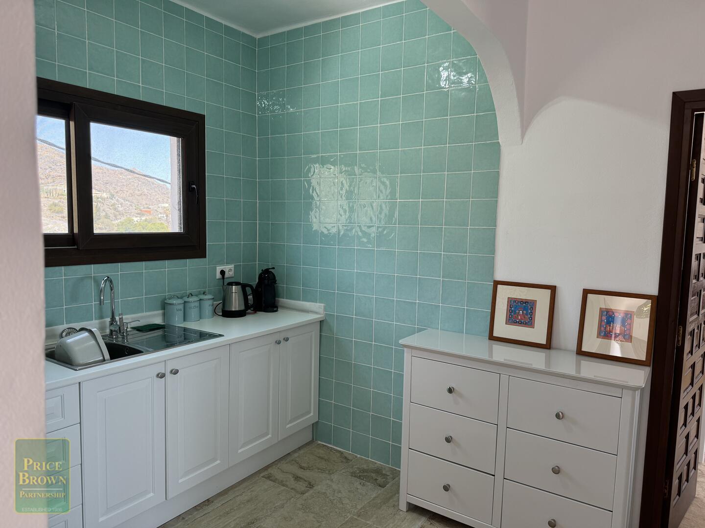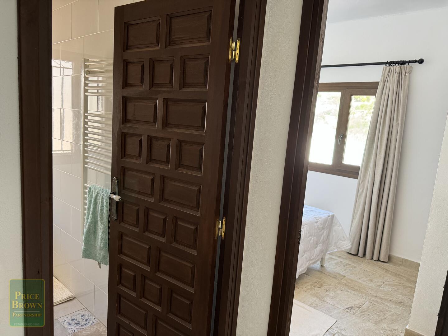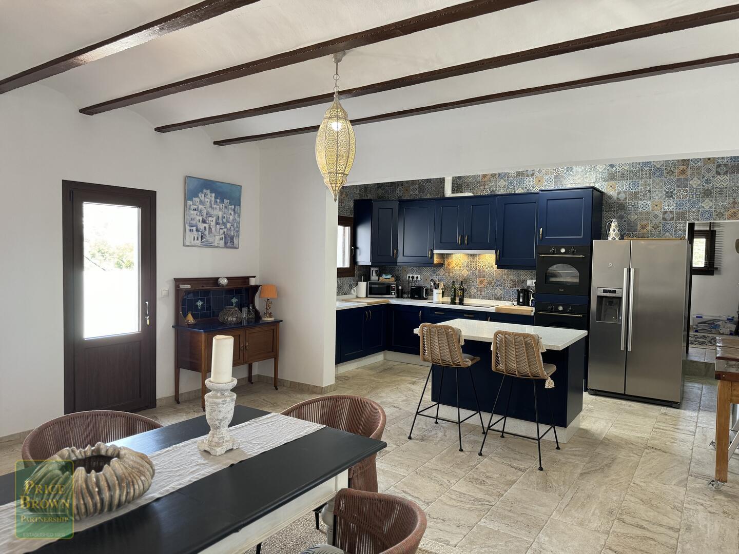 La casa principal consta de un área de entrada externa parcialmente cubierta con arcos que albergan una gran mesa de comedor perfecta para cenar al aire libre. Desde aquí se accede a la propiedad principal que consta de comedor de planta abierta, sala de estar y cocina, lavadero, dormitorio doble con baño en suite, dos dormitorios dobles; uno actualmente utilizado como oficina y un baño familiar. La sala de estar tiene una chimenea abierta y puertas dobles que dan a una terraza con excelentes vistas a las montañas. La cocina es moderna pero con carácter, con una hermosa isla central. Ambos baños presentan líneas limpias y despejadas.