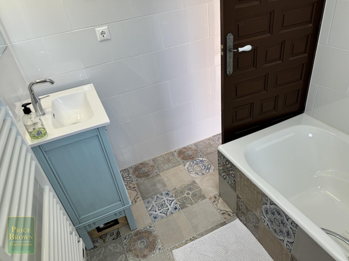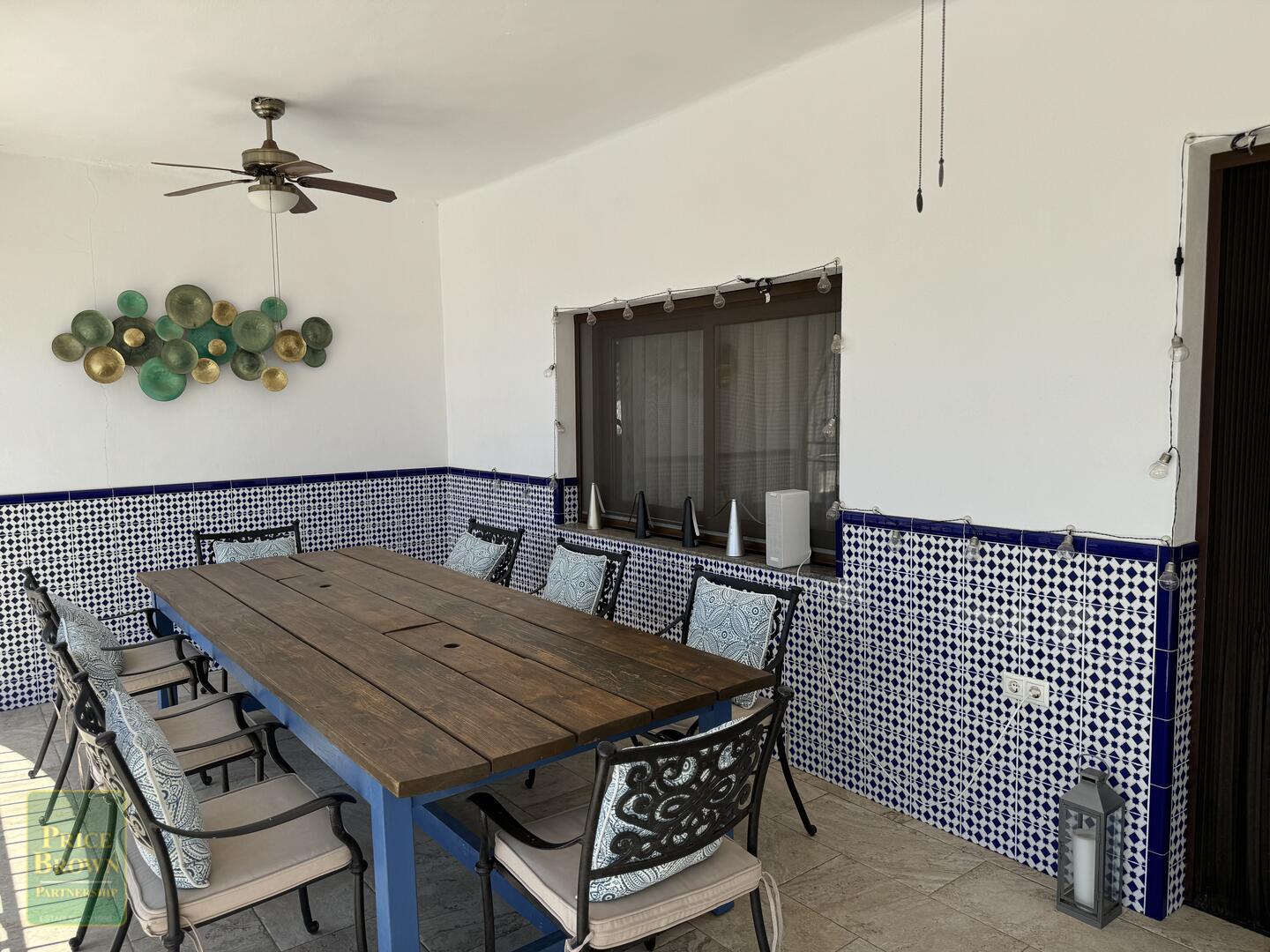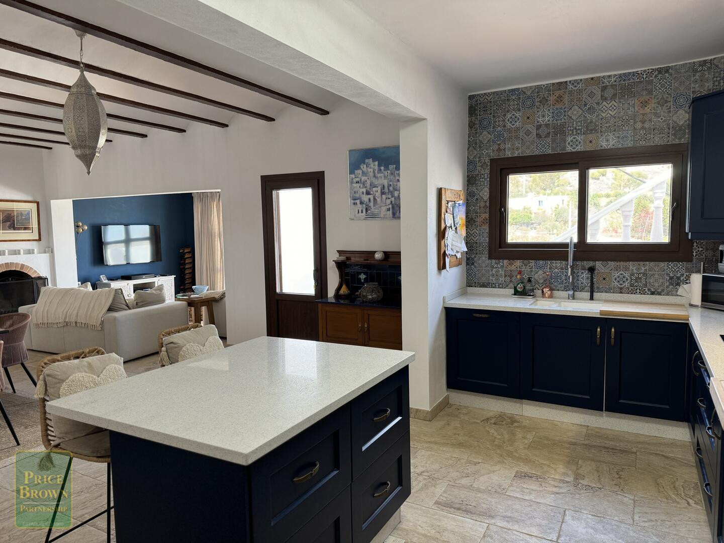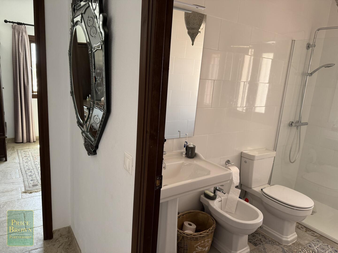 La casa principal consta de un área de entrada externa parcialmente cubierta con arcos que albergan una gran mesa de comedor perfecta para cenar al aire libre. Desde aquí se accede a la propiedad principal que consta de comedor de planta abierta, sala de estar y cocina, lavadero, dormitorio doble con baño en suite, dos dormitorios dobles; uno actualmente utilizado como oficina y un baño familiar. La sala de estar tiene una chimenea abierta y puertas dobles que dan a una terraza con excelentes vistas a las montañas. La cocina es moderna pero con carácter, con una hermosa isla central. Ambos baños presentan líneas limpias y despejadas.