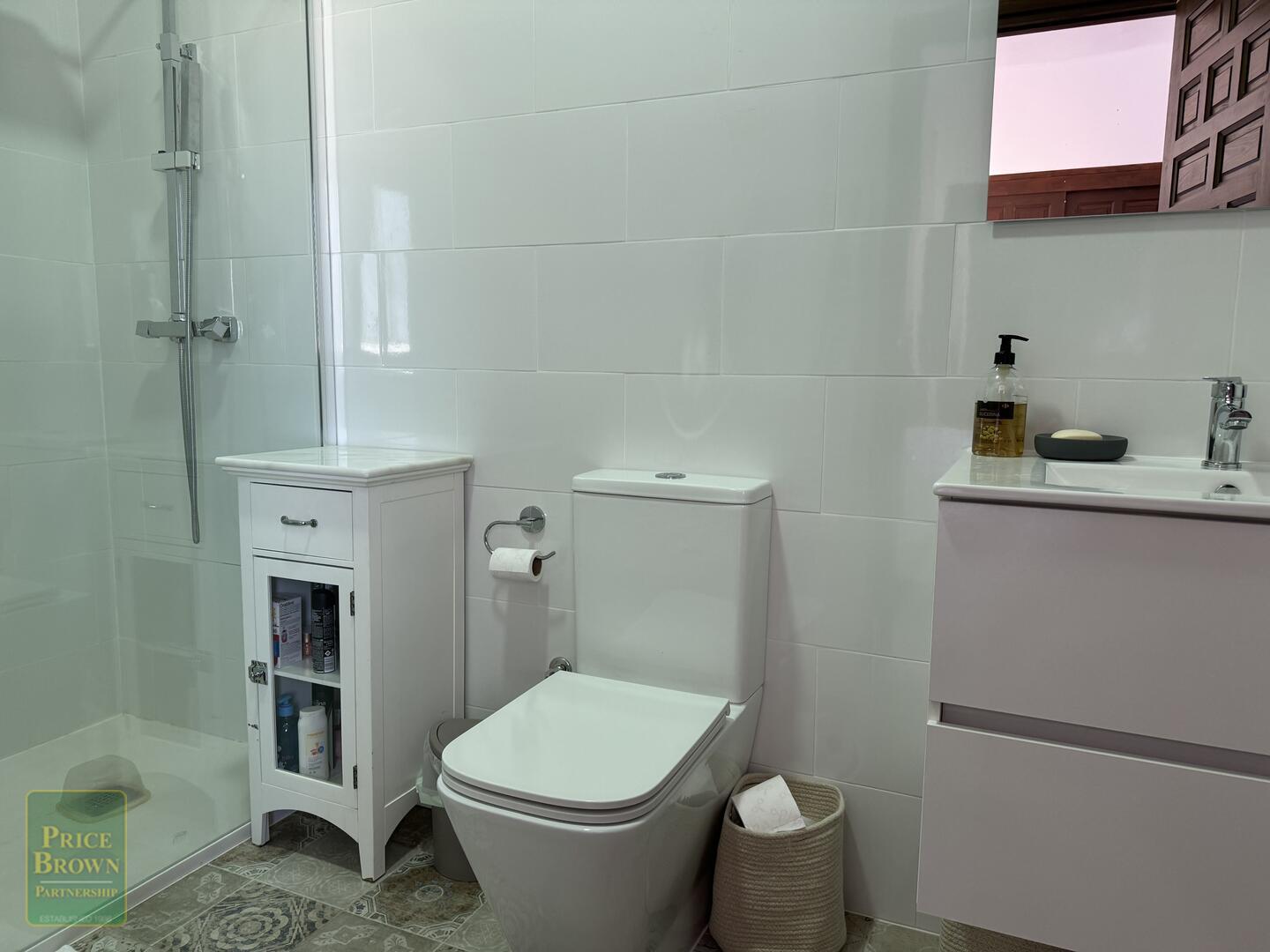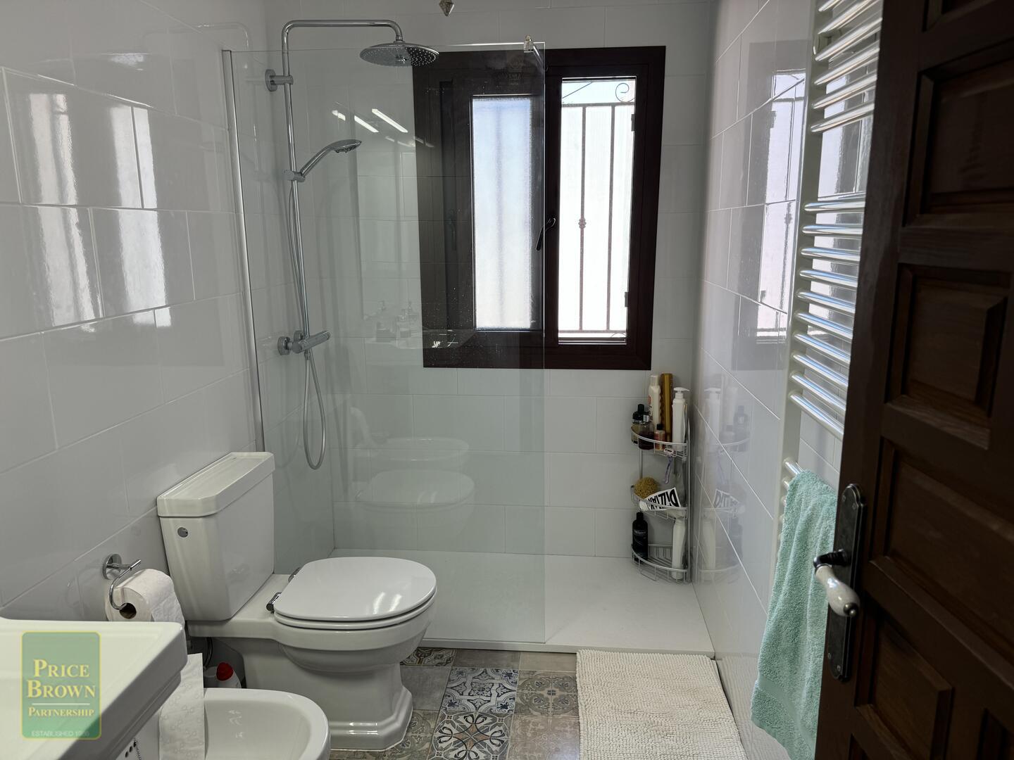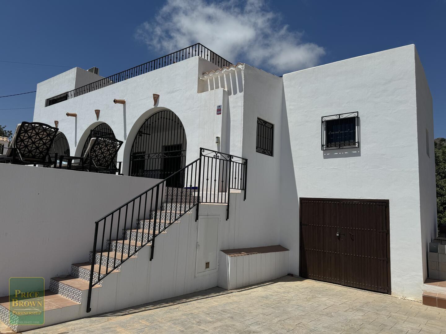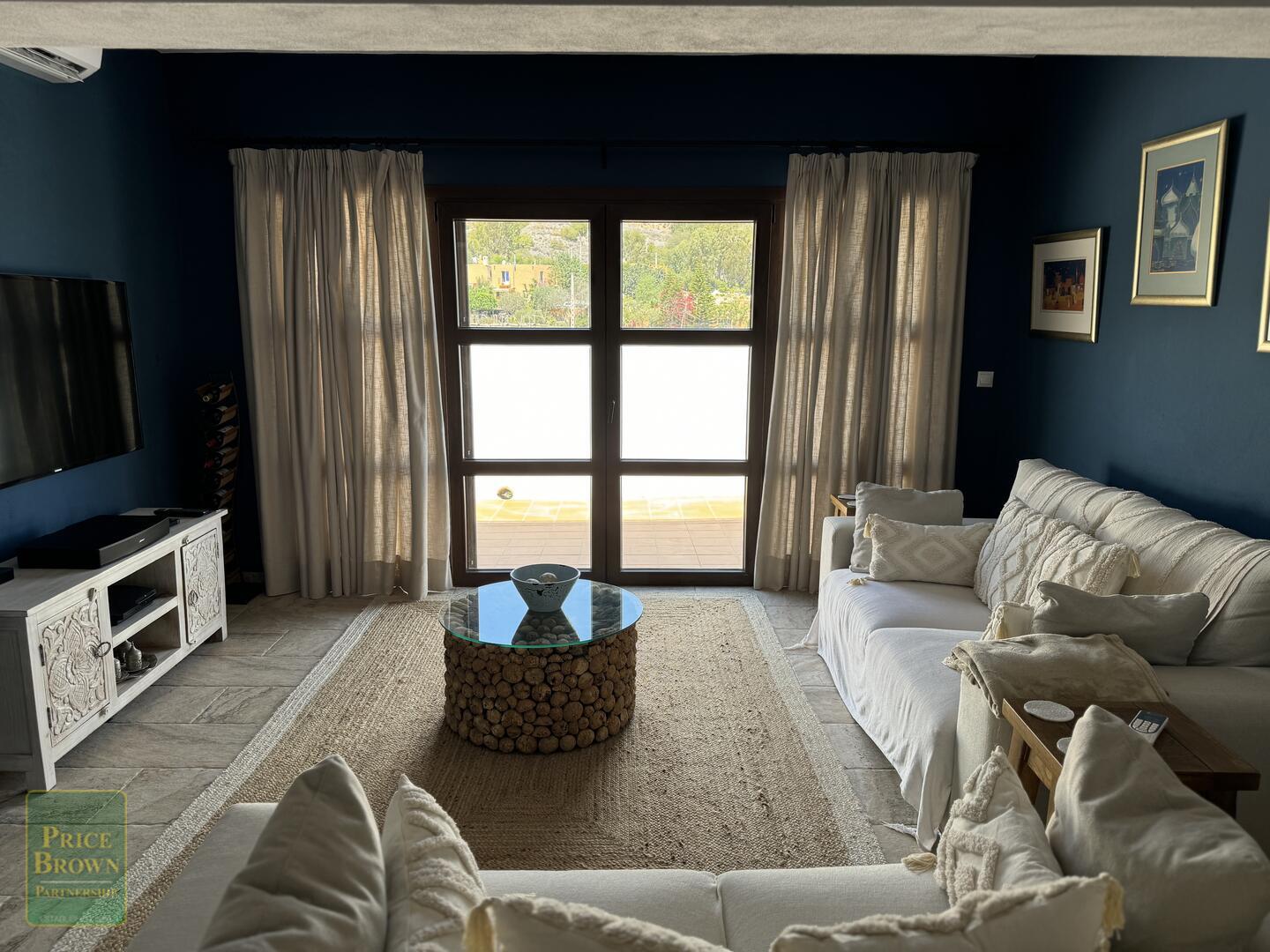 La casa principal consta de un área de entrada externa parcialmente cubierta con arcos que albergan una gran mesa de comedor perfecta para cenar al aire libre. Desde aquí se accede a la propiedad principal que consta de comedor de planta abierta, sala de estar y cocina, lavadero, dormitorio doble con baño en suite, dos dormitorios dobles; uno actualmente utilizado como oficina y un baño familiar. La sala de estar tiene una chimenea abierta y puertas dobles que dan a una terraza con excelentes vistas a las montañas. La cocina es moderna pero con carácter, con una hermosa isla central. Ambos baños presentan líneas limpias y despejadas.