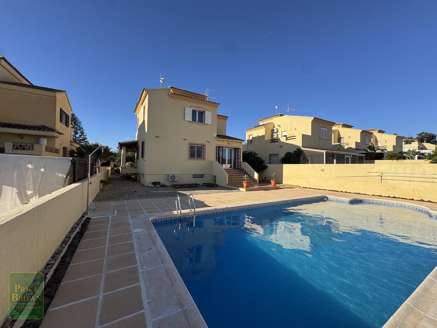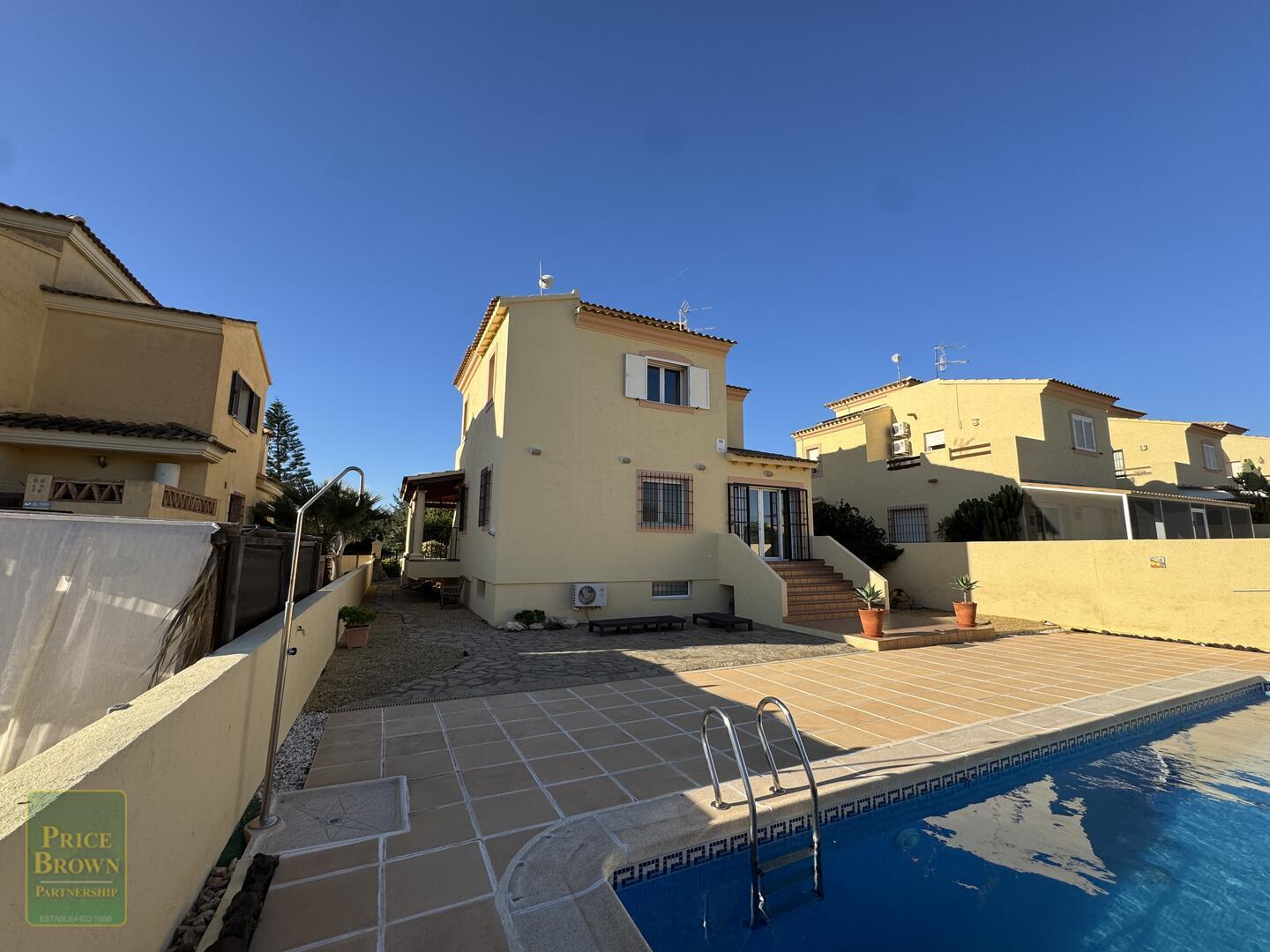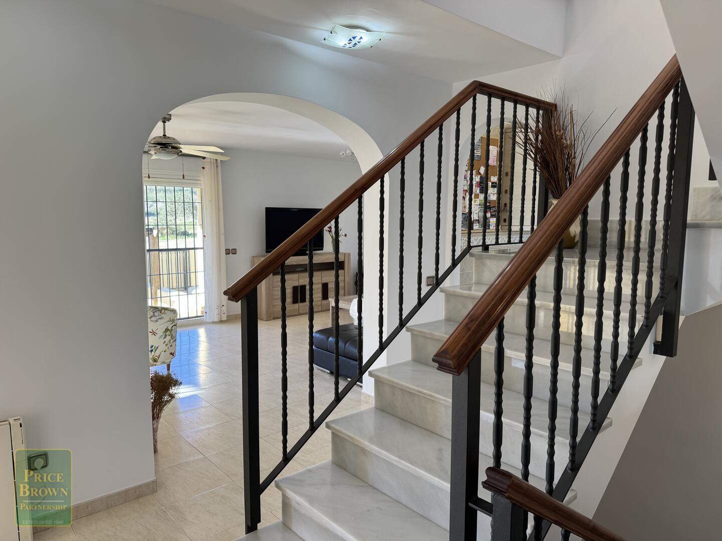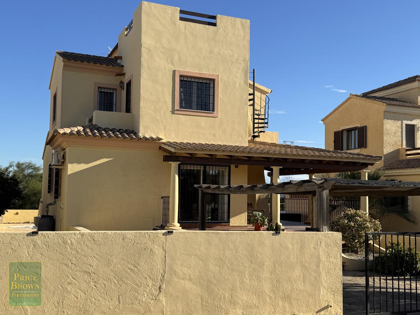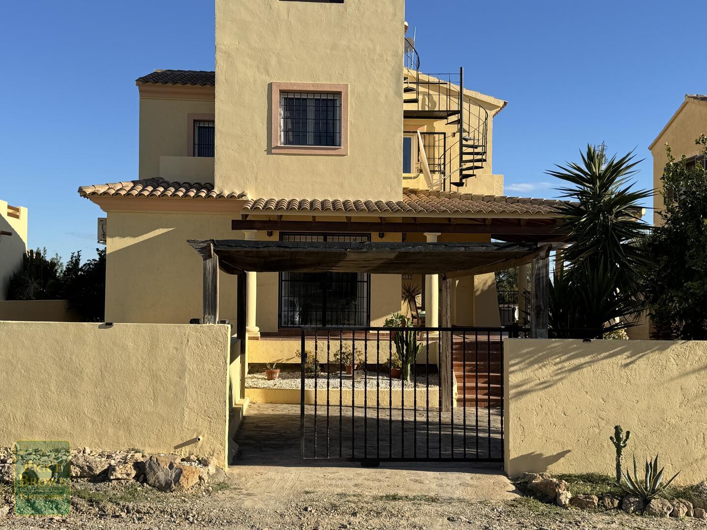 La Algarrabina, Vera: Appealing detached villa located close to the golf course at Desert Springs and just a short drive to the bustling town of Vera. La Algarrabina is a peaceful neighbourhood with a selection of well presented and stylish properties. Access to the property is easy, and we offer for sale one in a row of 4 similar properties. It comprises at ground floor; covered entrance terrace, hallway, living room, kitchen with access to the pool area, one double bedroom and a bathroom. A staircase from the hallway leads to the upper floor where you have three double bedrooms and 2 bathrooms; the master bedroom has an en-suite bathroom. A staircase from the hallway leads to the lower floor where you have a huge space currently designated to a 5th bedroom, study area and a garage. In addition, there is a roof terrace showcasing the wonderful country views, air conditioning throughout. There is a larger than normal 10 x 5 swimming pool. The property has recently been painted both inside and outside.