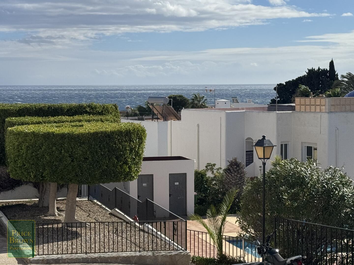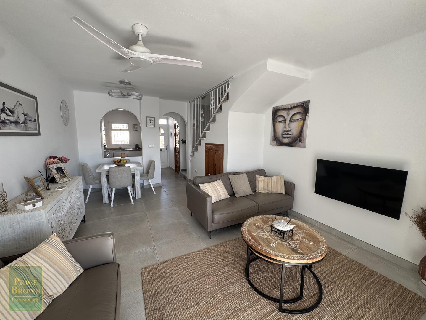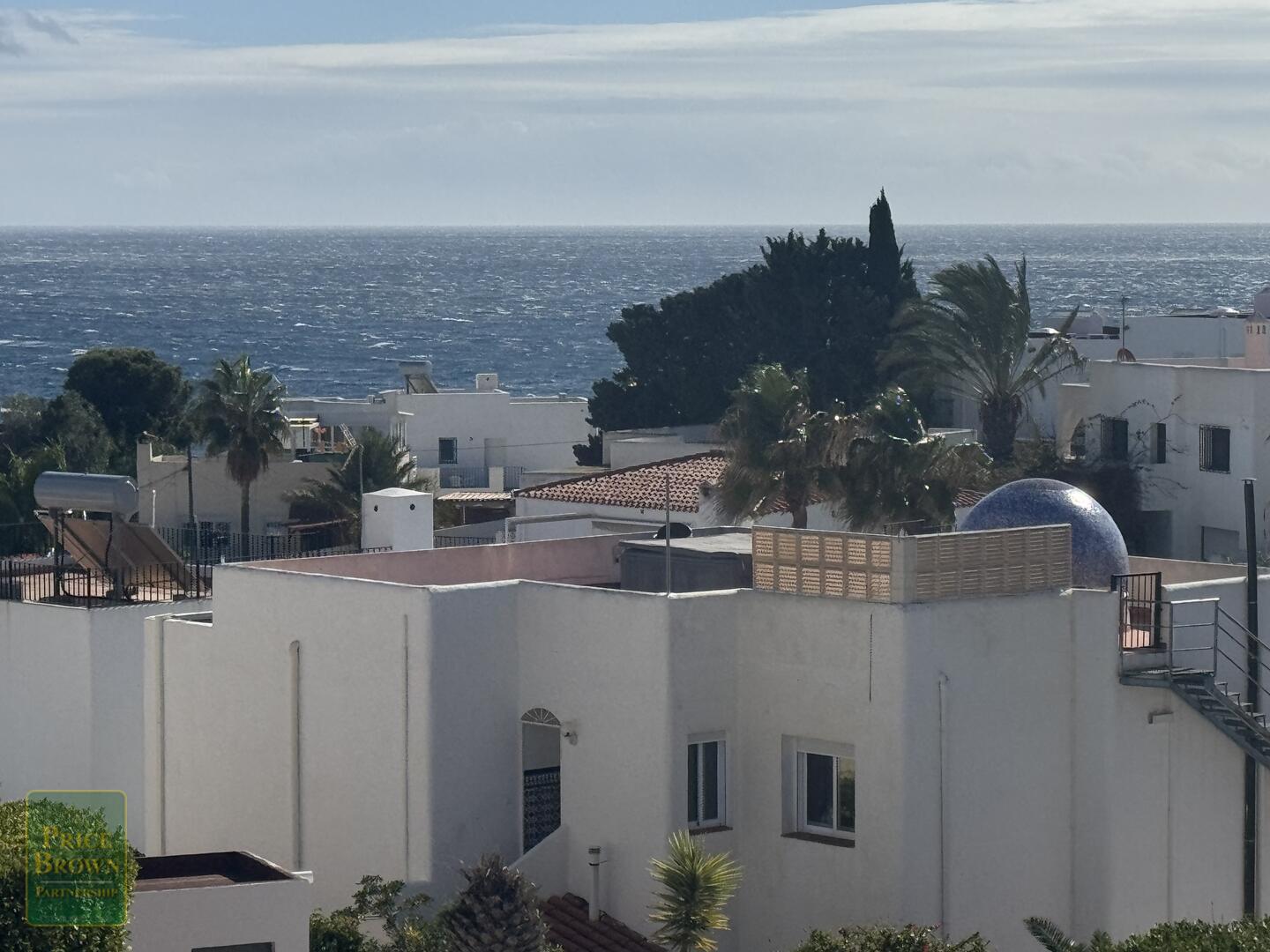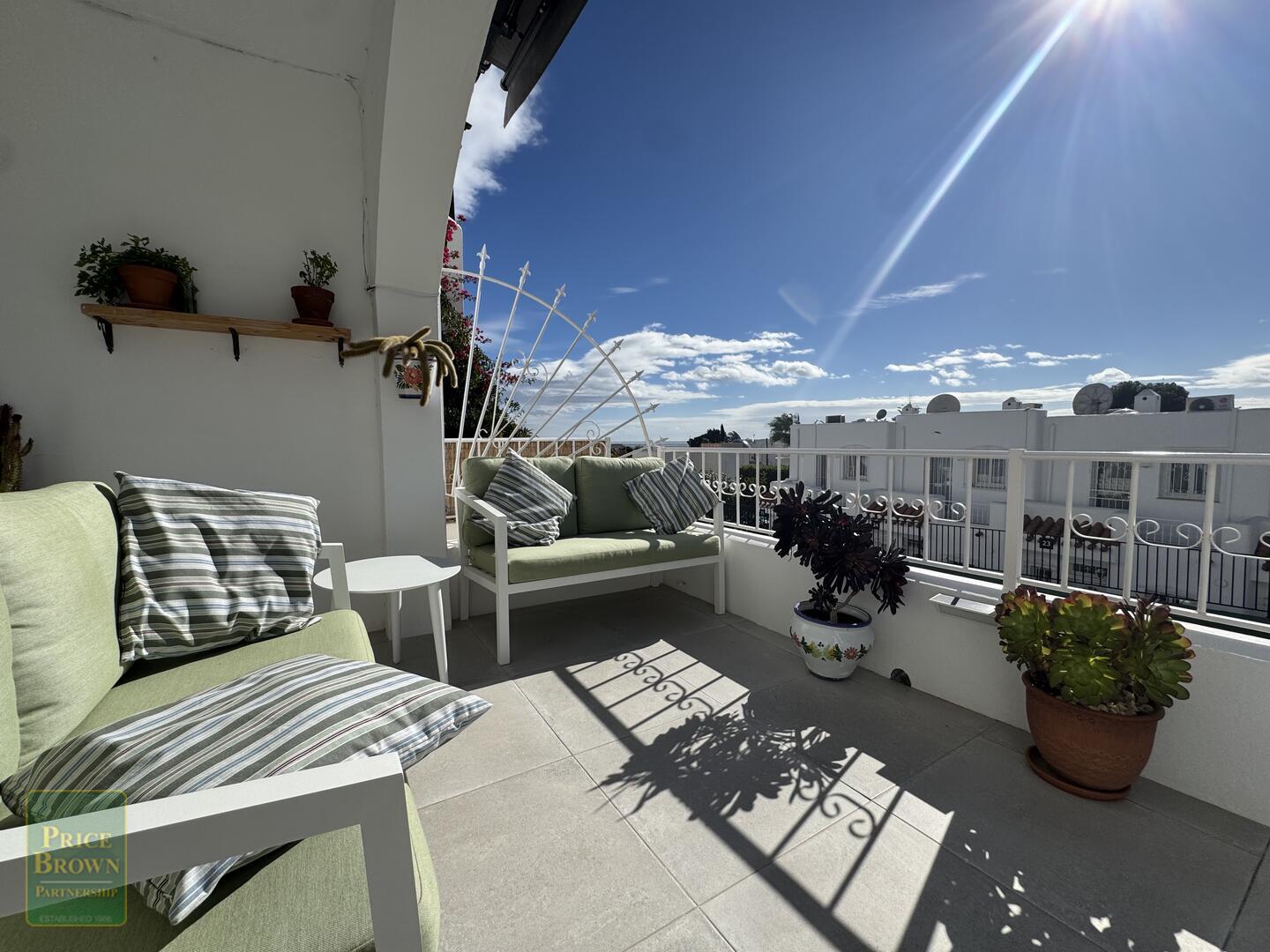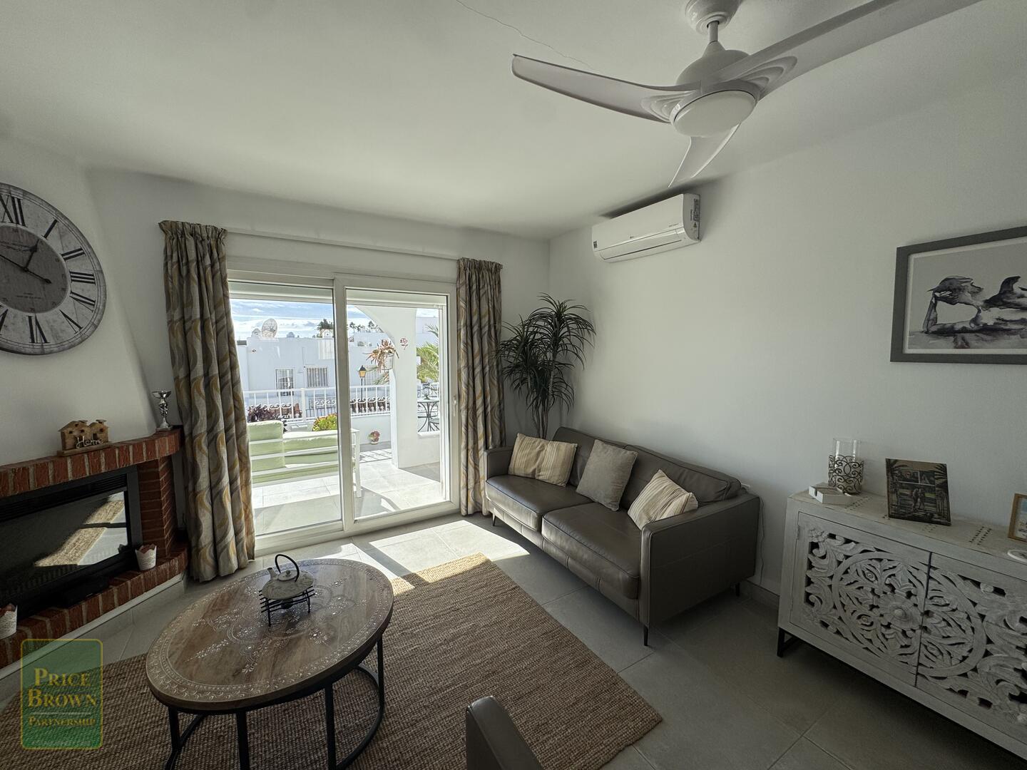 Las Brisas I : Superbly presented duplex property lovingly modernized by the current owners. The complex itself is well maintained and benefits from large communal pool with grassy surround, gated car parking area, together with sea and mountain views. Constructed over two levels on the ground floor there is a newly installed, high-tech. kitchen, a good size living room / dining room with working fireplace, air conditioning and patio doors to the terrace and a cloakroom with toilet and sink. There is also under/stair storage. The living room exposes the staircase which takes you to the upper floor and here you have two double bedrooms both with air conditioning, built in wardrobes and both with access to a terrace with sea views, a family bathroom with huge walk in shower.