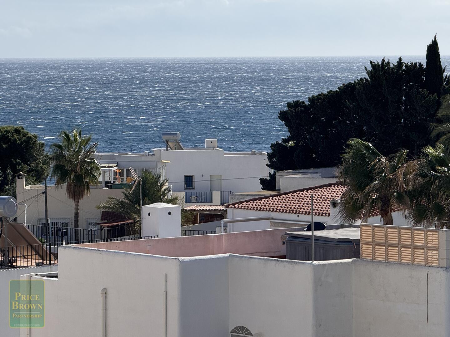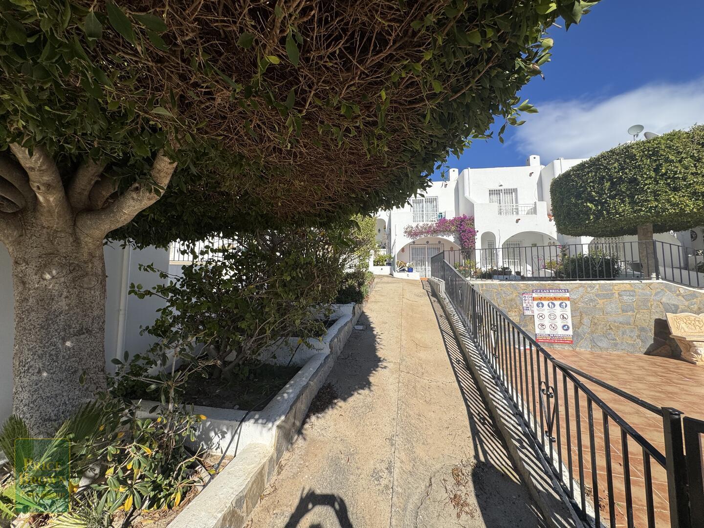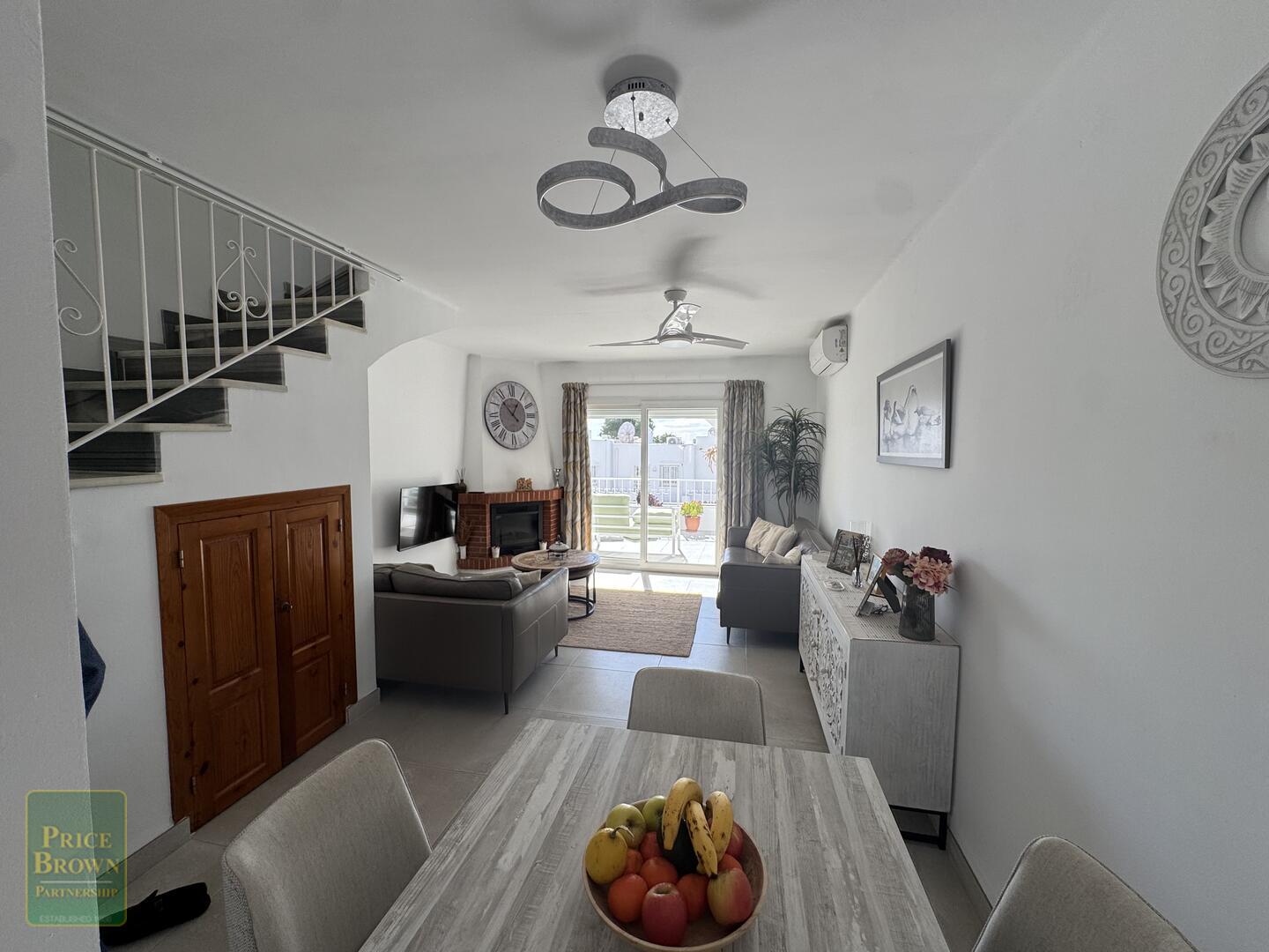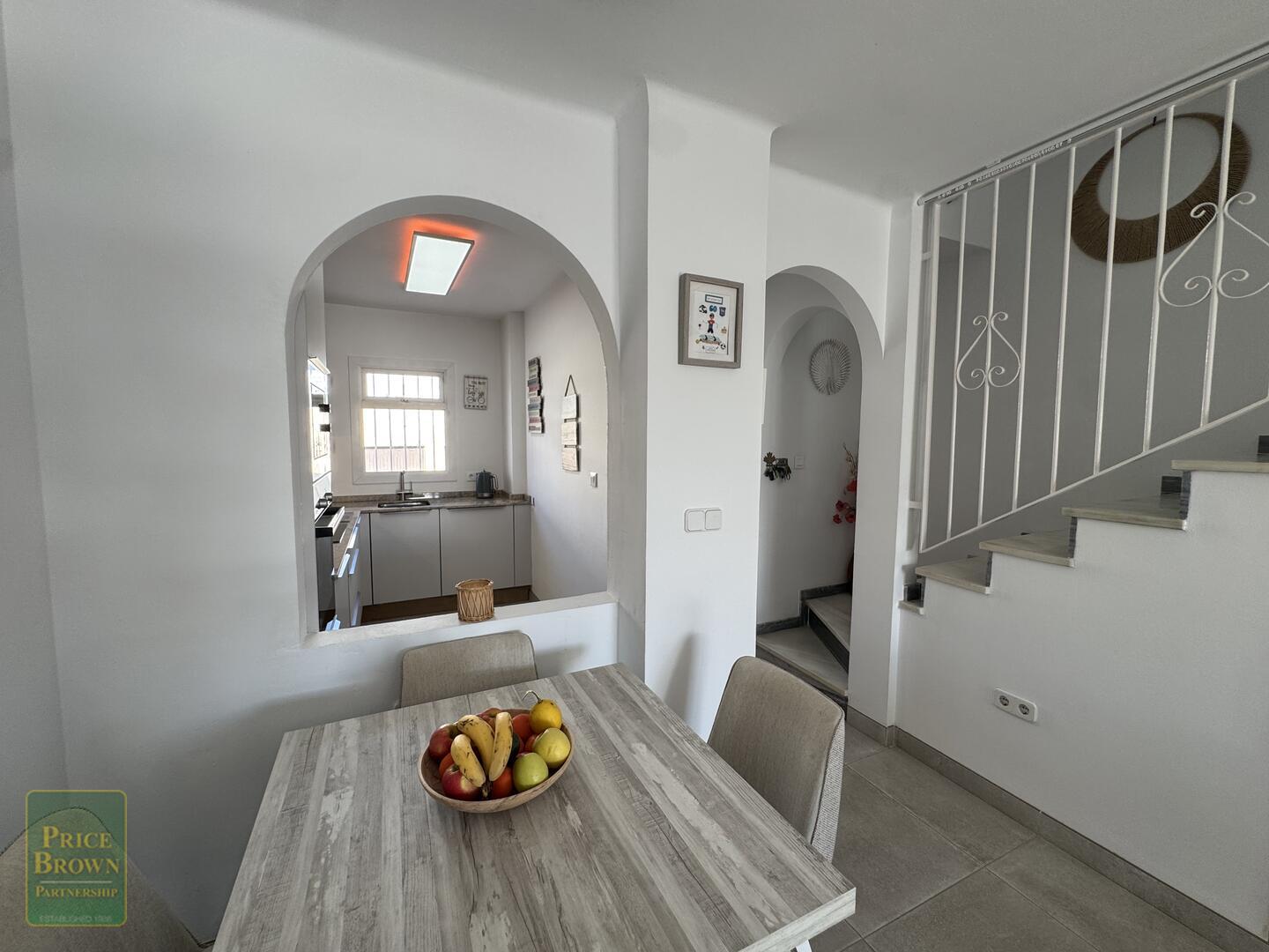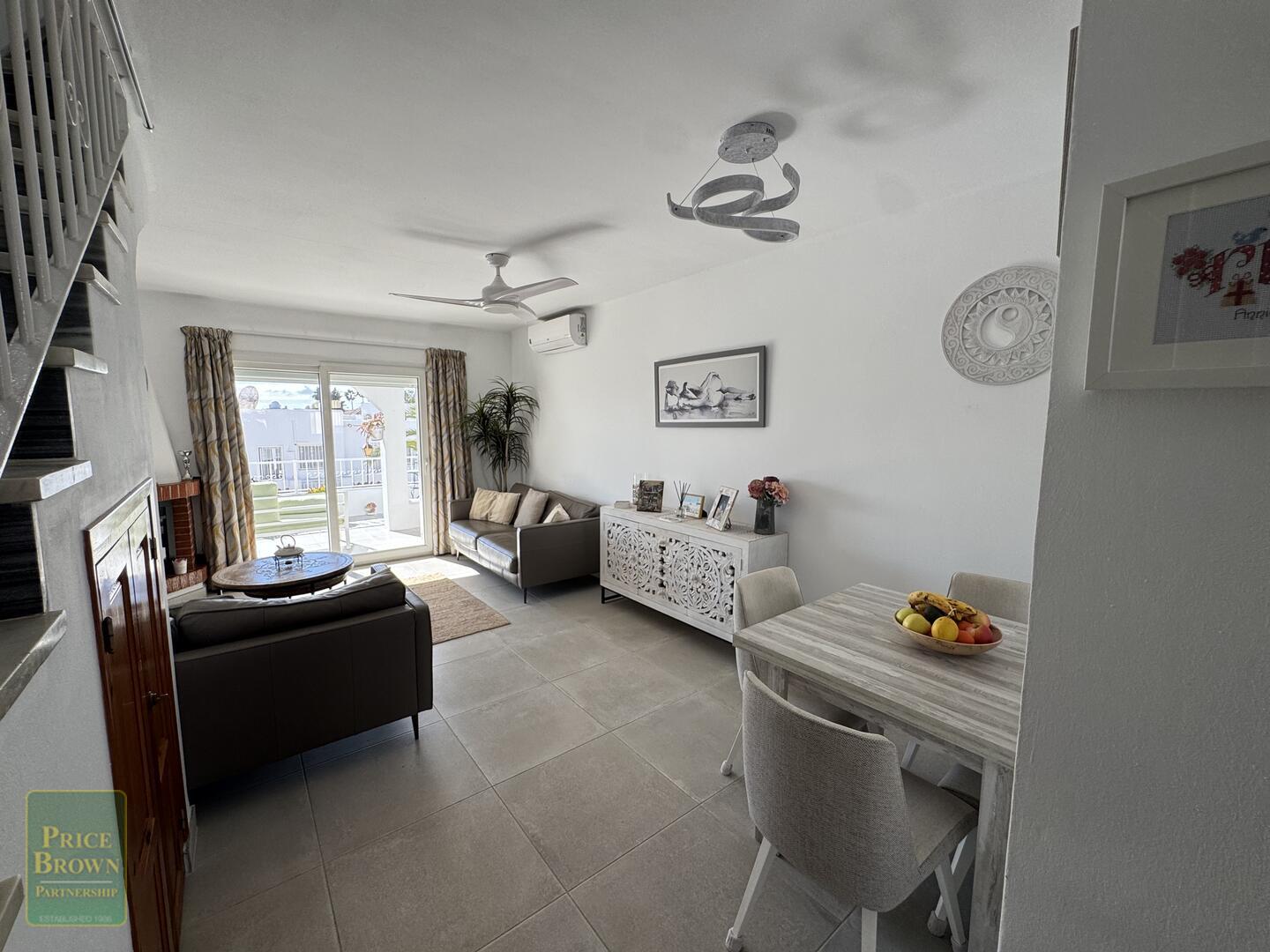 Las Brisas I : Superbly presented duplex property lovingly modernized by the current owners. The complex itself is well maintained and benefits from large communal pool with grassy surround, gated car parking area, together with sea and mountain views. Constructed over two levels on the ground floor there is a newly installed, high-tech. kitchen, a good size living room / dining room with working fireplace, air conditioning and patio doors to the terrace and a cloakroom with toilet and sink. There is also under/stair storage. The living room exposes the staircase which takes you to the upper floor and here you have two double bedrooms both with air conditioning, built in wardrobes and both with access to a terrace with sea views, a family bathroom with huge walk in shower.