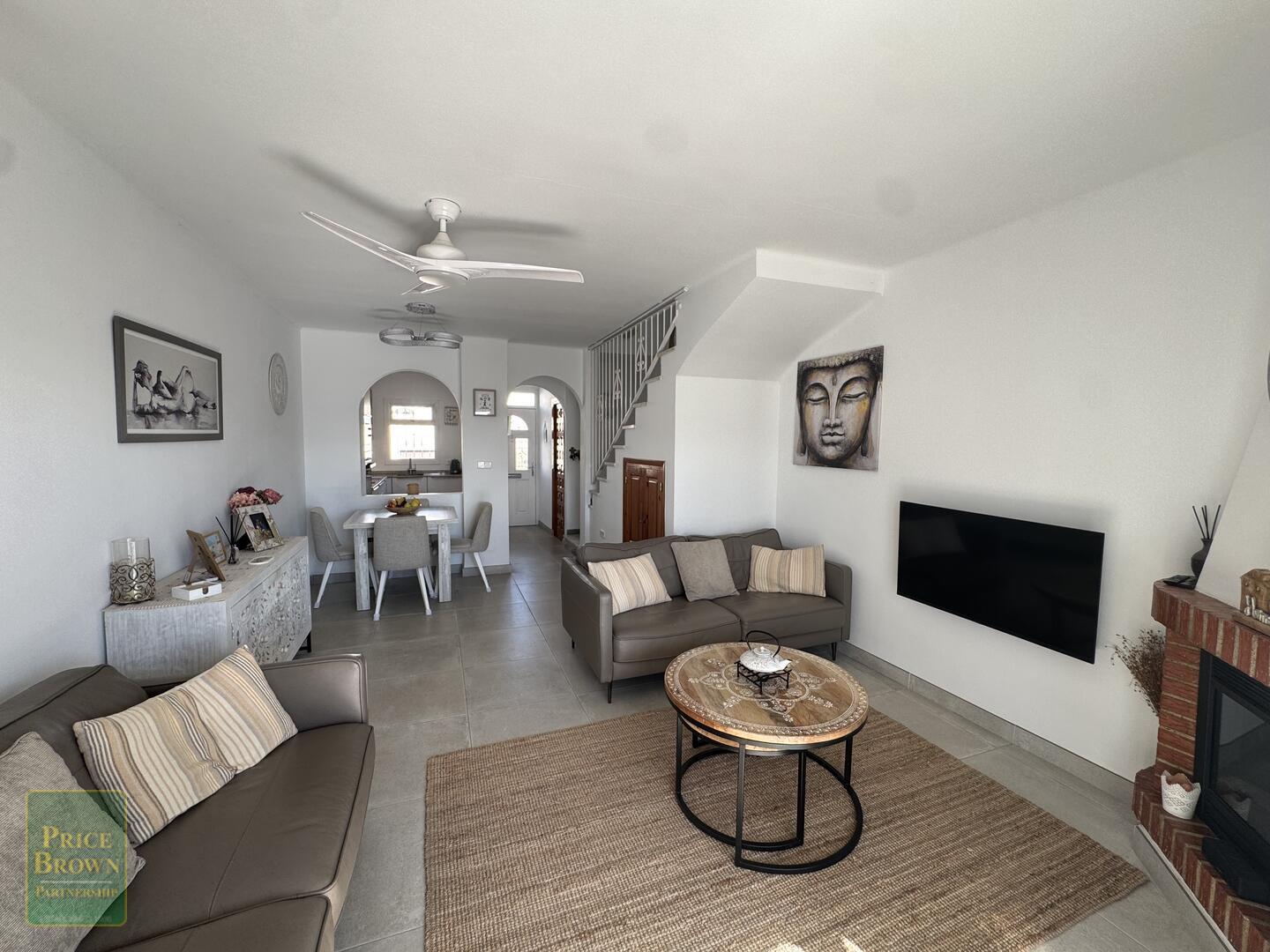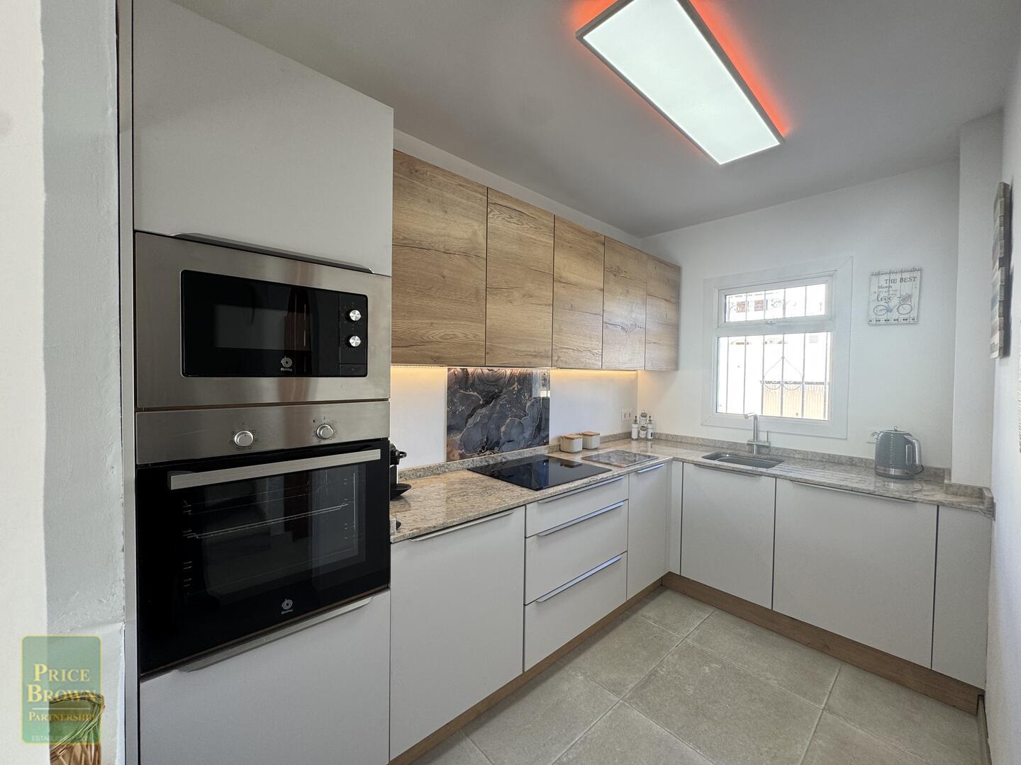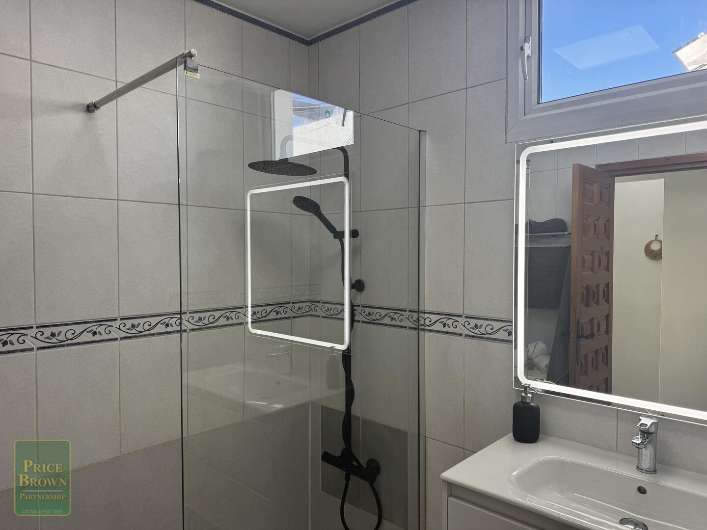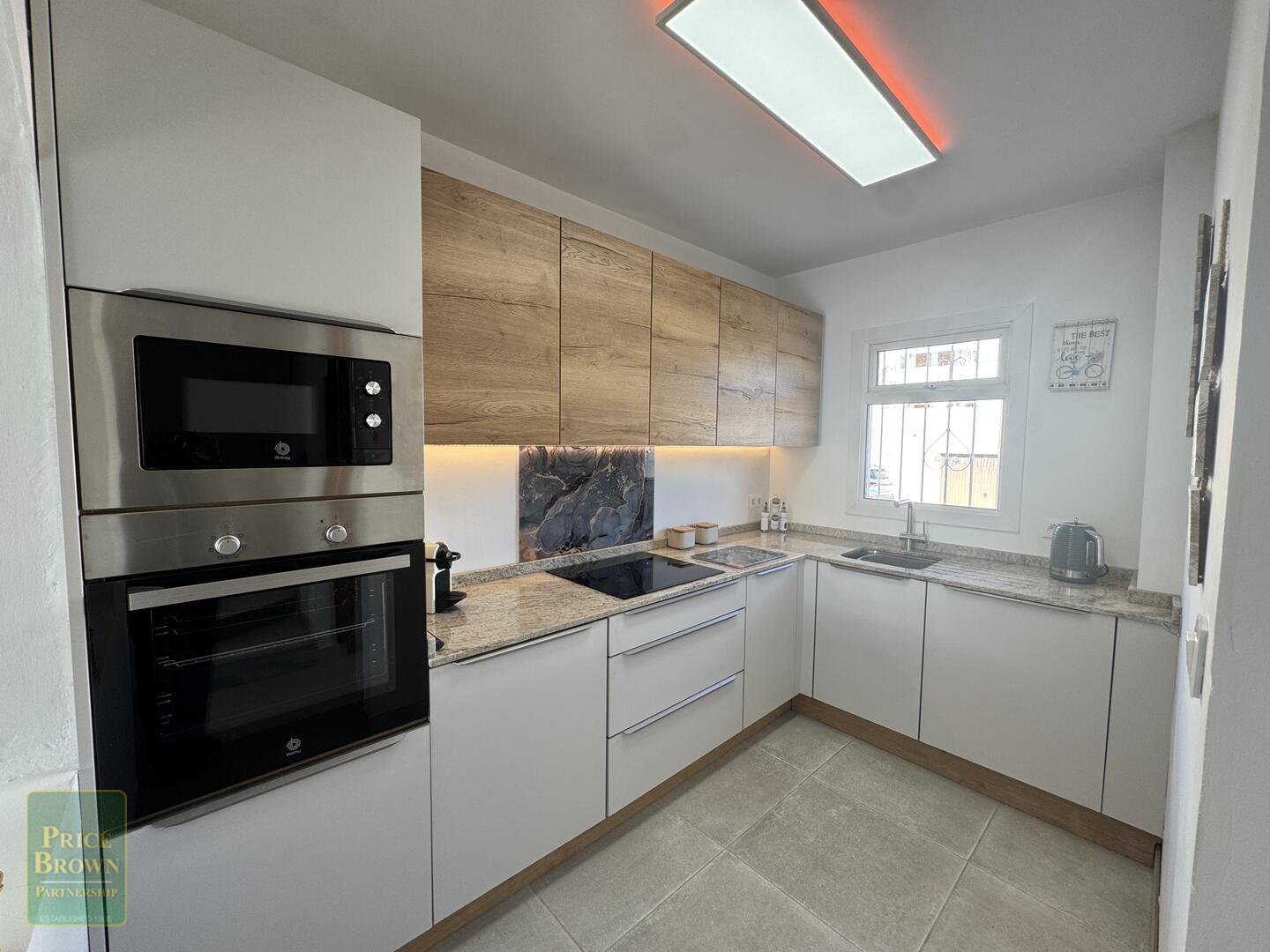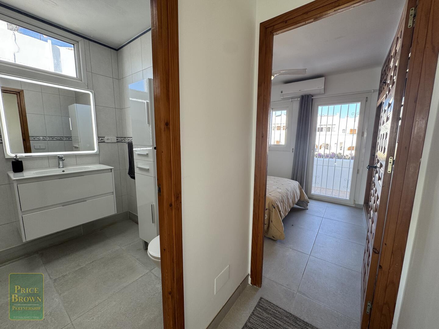 Las Brisas I : Superbly presented duplex property lovingly modernized by the current owners. The complex itself is well maintained and benefits from large communal pool with grassy surround, gated car parking area, together with sea and mountain views. Constructed over two levels on the ground floor there is a newly installed, high-tech. kitchen, a good size living room / dining room with working fireplace, air conditioning and patio doors to the terrace and a cloakroom with toilet and sink. There is also under/stair storage. The living room exposes the staircase which takes you to the upper floor and here you have two double bedrooms both with air conditioning, built in wardrobes and both with access to a terrace with sea views, a family bathroom with huge walk in shower.