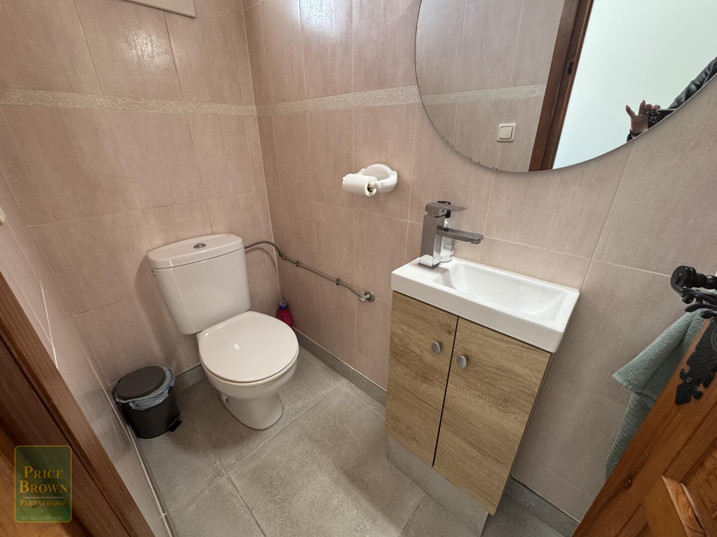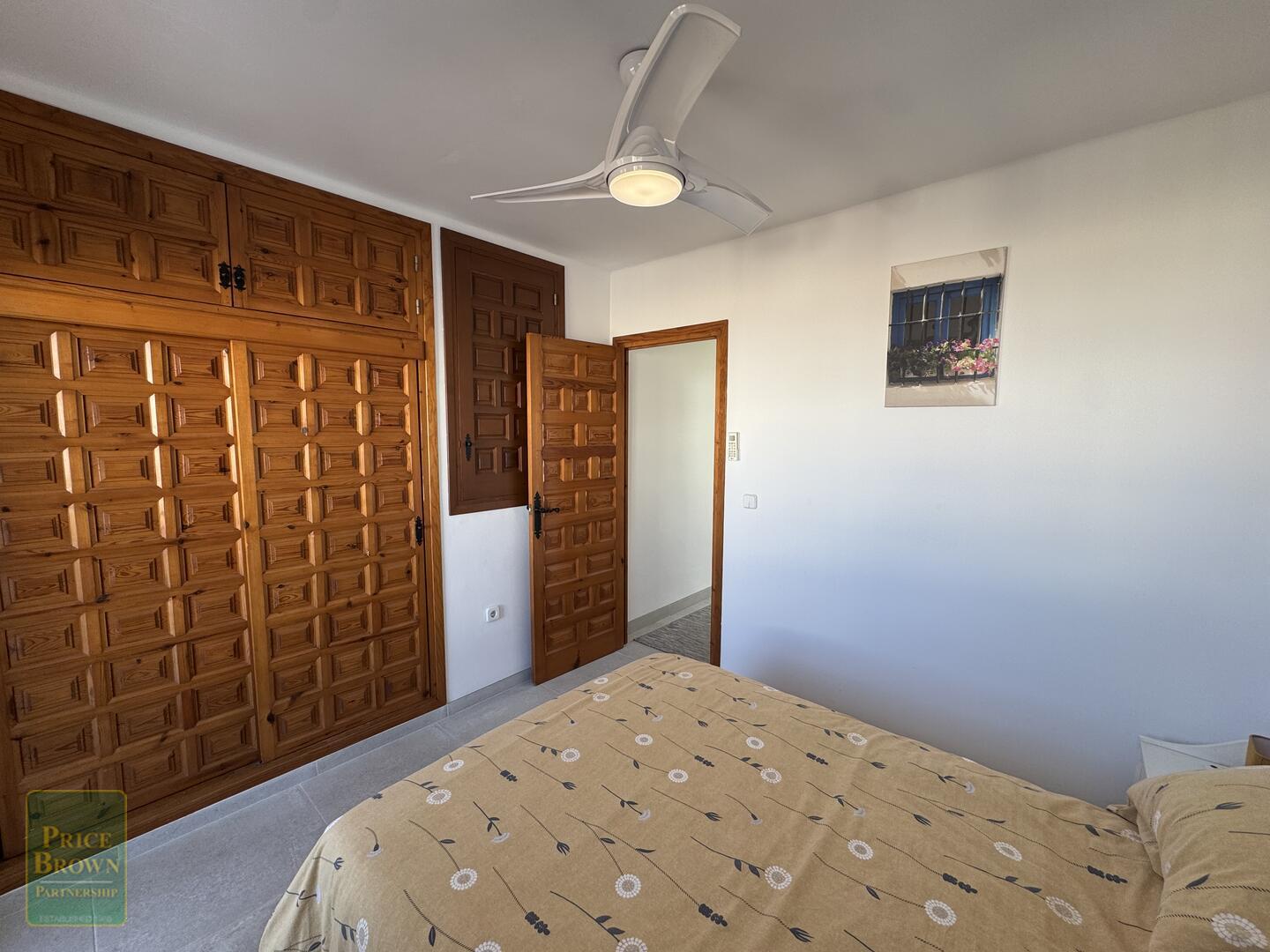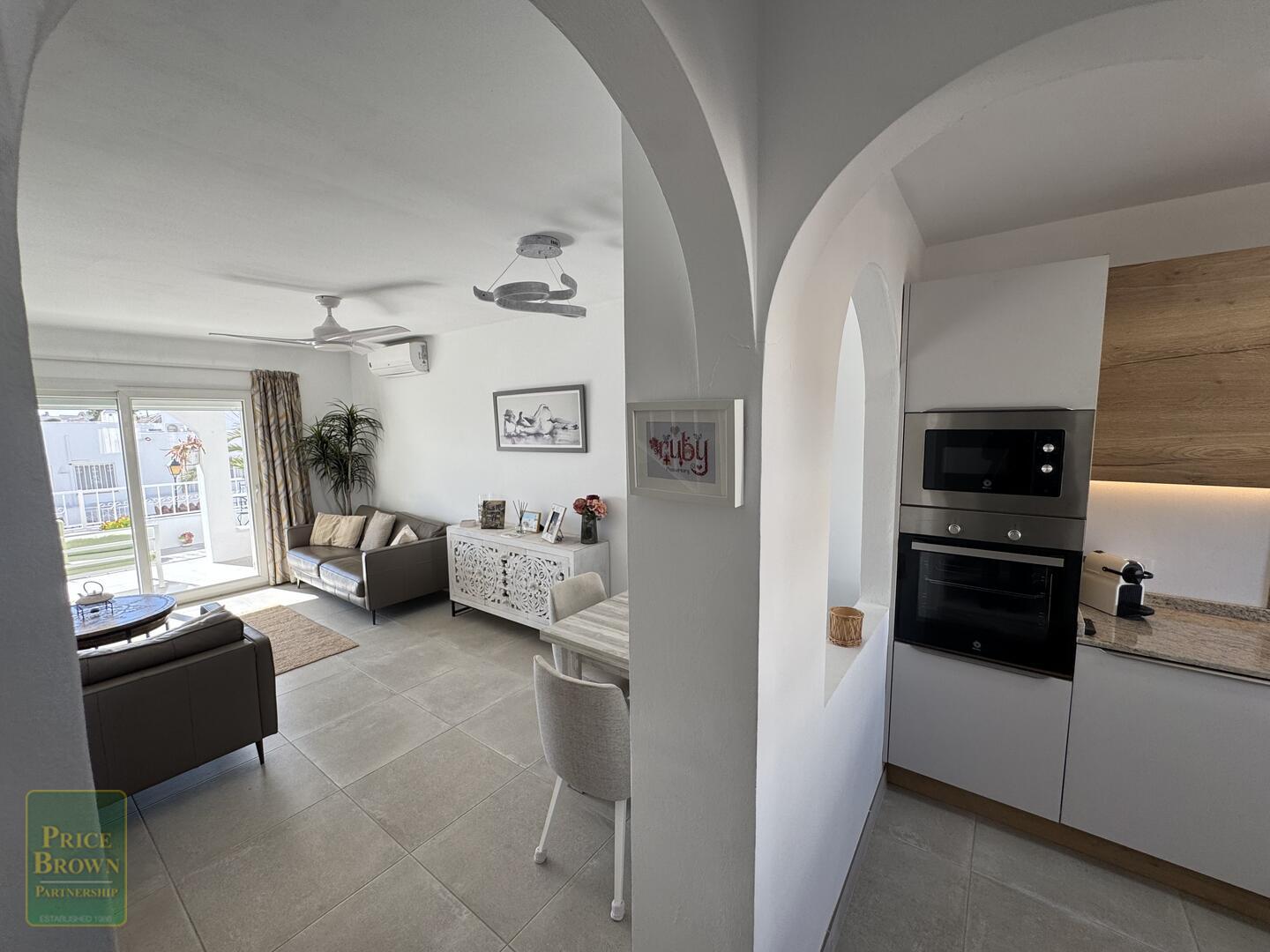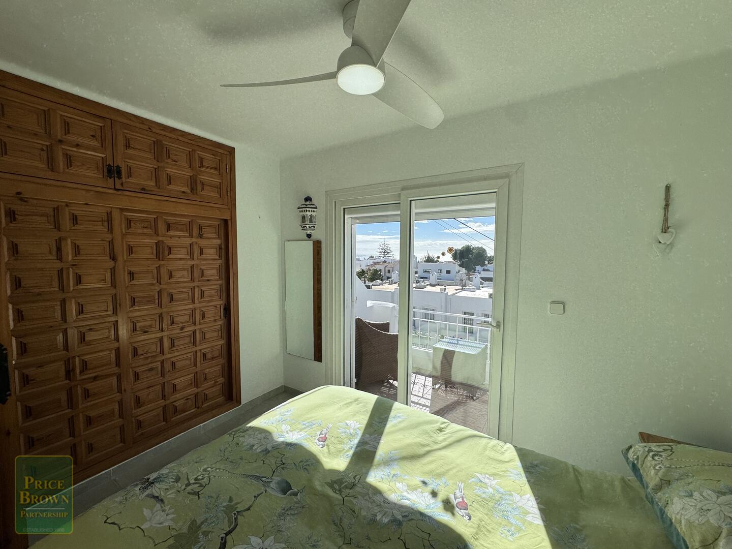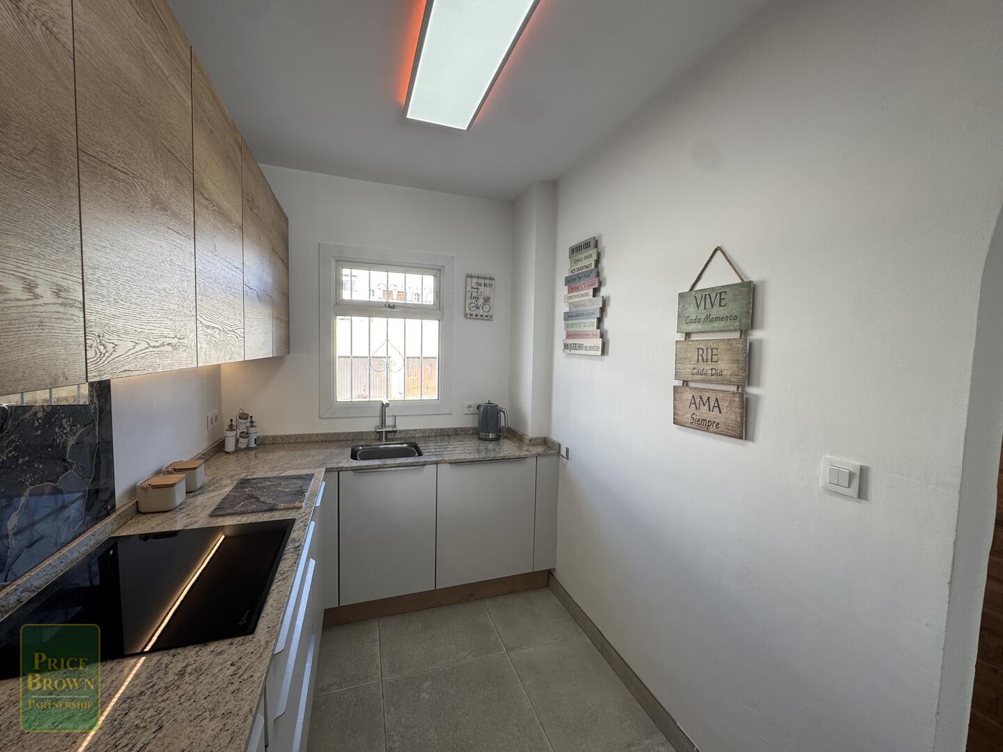 Las Brisas I : Superbly presented duplex property lovingly modernized by the current owners. The complex itself is well maintained and benefits from large communal pool with grassy surround, gated car parking area, together with sea and mountain views. Constructed over two levels on the ground floor there is a newly installed, high-tech. kitchen, a good size living room / dining room with working fireplace, air conditioning and patio doors to the terrace and a cloakroom with toilet and sink. There is also under/stair storage. The living room exposes the staircase which takes you to the upper floor and here you have two double bedrooms both with air conditioning, built in wardrobes and both with access to a terrace with sea views, a family bathroom with huge walk in shower.