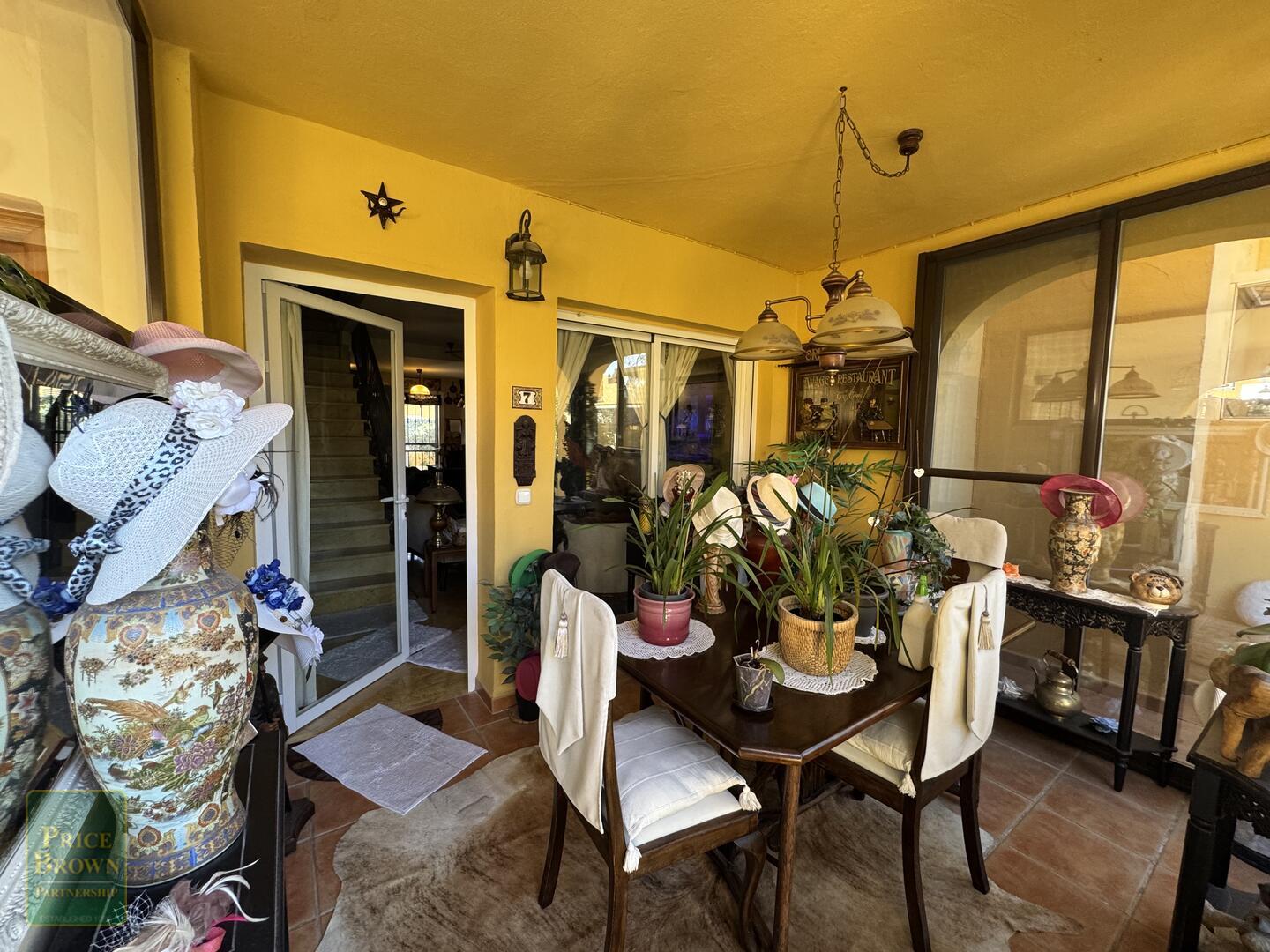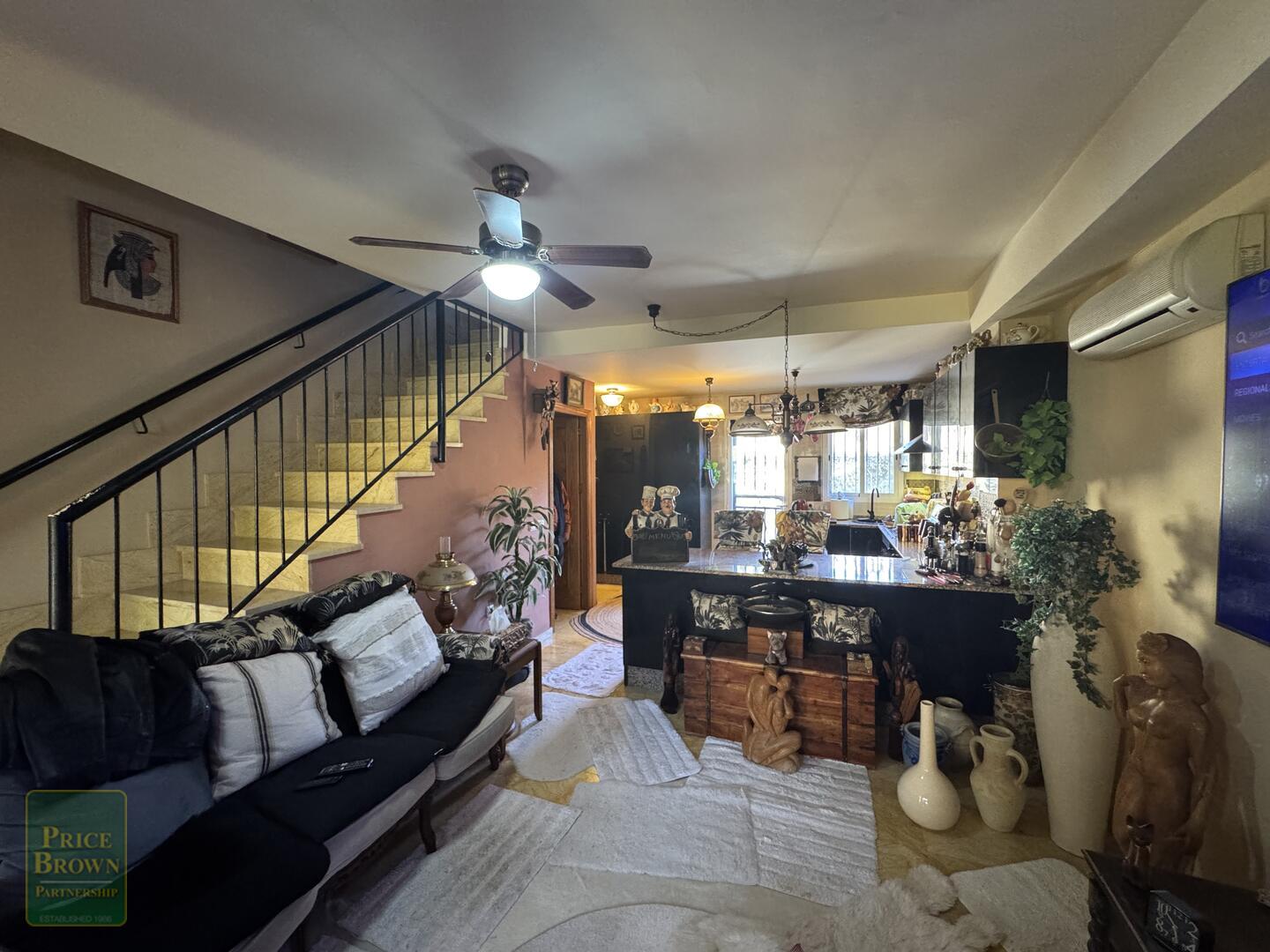 The property comprises at entrance level a private garden which leads you to the main entrance to the property. Here you have a lovely summer room which is a perfect spot for dining, there is a large living room open to the kitchen which houses a pellet burner and an open staircase to the first floor. Doors from the kitchen lead to the rear terrace and cloakroom, and with direct access to the communal swimming pool.