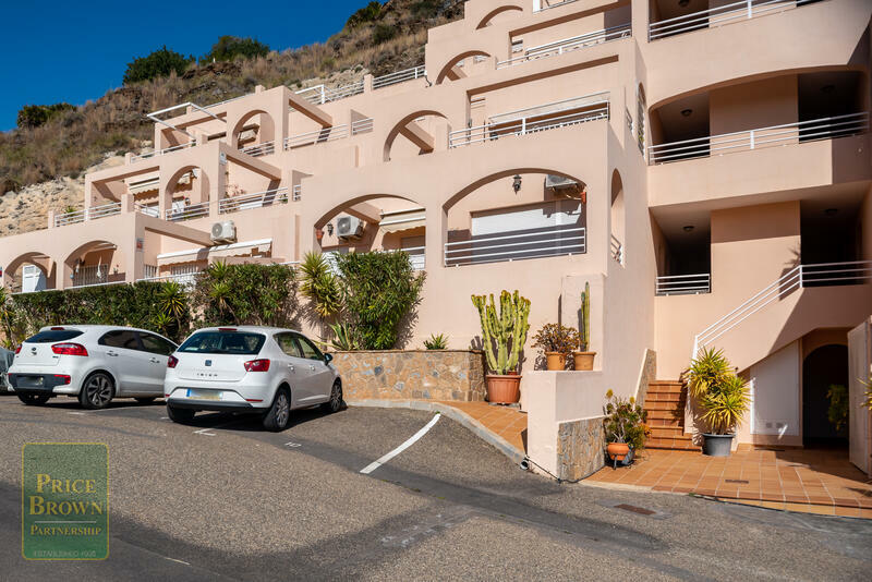 This lovely apartment has two bedrooms and two bathrooms. The main bedroom with a double bed and an en-suite bathroom with a bathtub, another bedroom with two single beds, and a second bathroom with a shower and the washing machine. There is an open kitchen where there is a dishwasher, a small individual refrigerator and an individual freezer, among others. A terrace with sea views. Bedrooms and lounge have air conditioning (hot/cold). There is English and Spanish TV, WIFI, and an allocated parking. The pool is outside around 1 minute by walk.